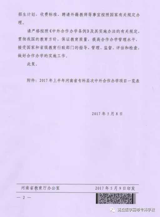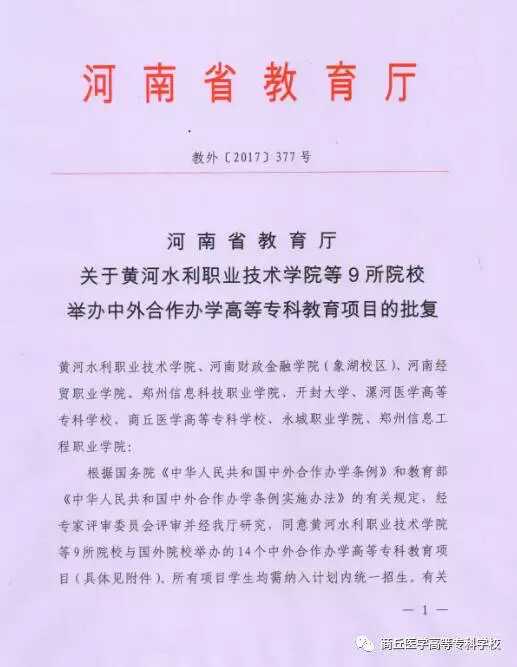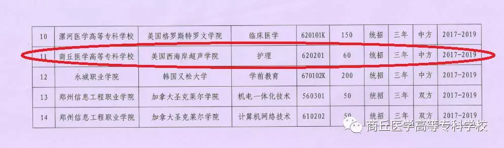 经省教育厅教外【2017】377号文件批准,商丘医学高等专科学校与美国西海岸超声学院(WCUI)联合举办中外合作办学护理专业,于2017年开始招生,计划招生60人,学制三年。这是我校继去年与美国西海岸超声学院(WCUI)合作医学影像技术专业后审批通过的专业。