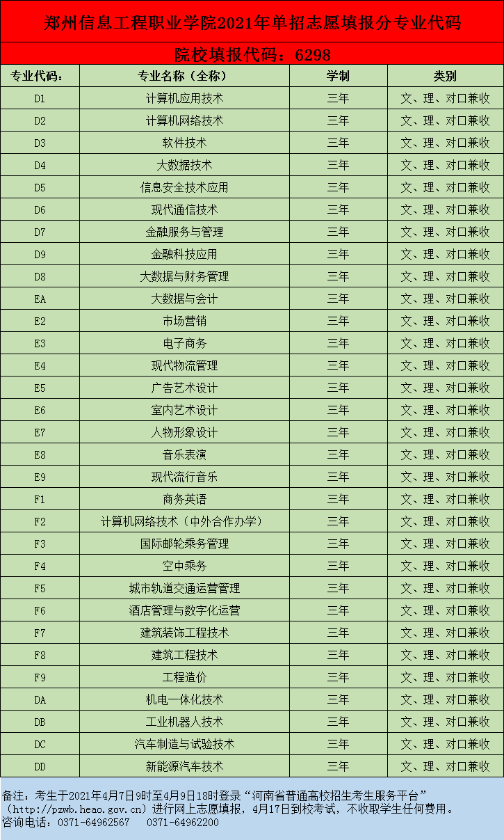 郑州信息工程职业学院2021年单招志愿填报分专业代码