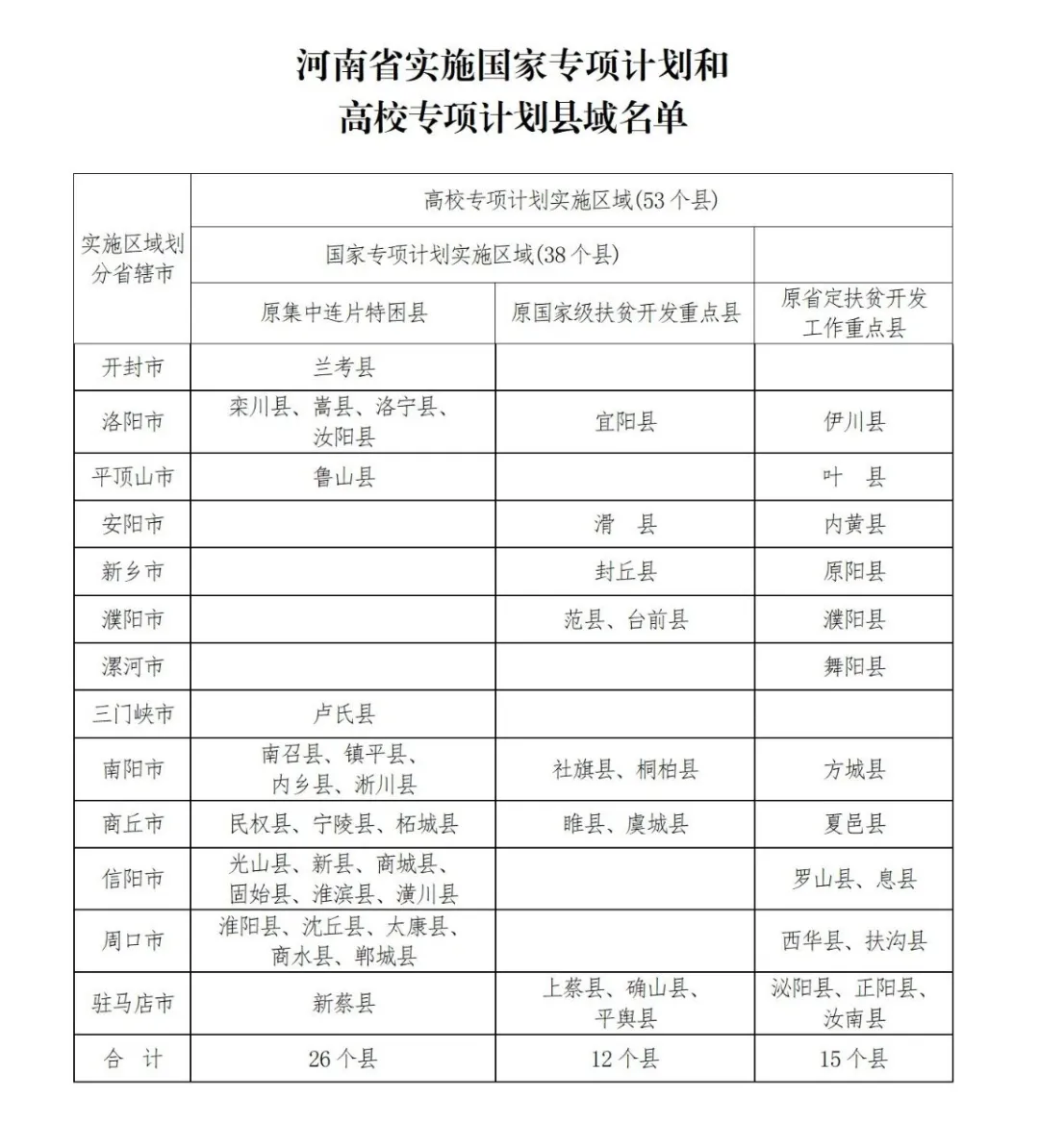 国家专项计划的实施区域为国家划定的38个县(包括26个原集中连片特殊困难县和12个原国家级扶贫开发重点县)。
