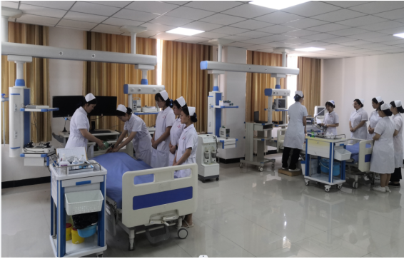 模拟手术室:模拟现代化层流手术室,分区设有手术间、洗手间、更衣室、缓冲间、复苏室,配备有麻醉机、电刀、多功能手术床、无影灯、心电监护仪、多功能吊塔、各种常见医疗器械等。