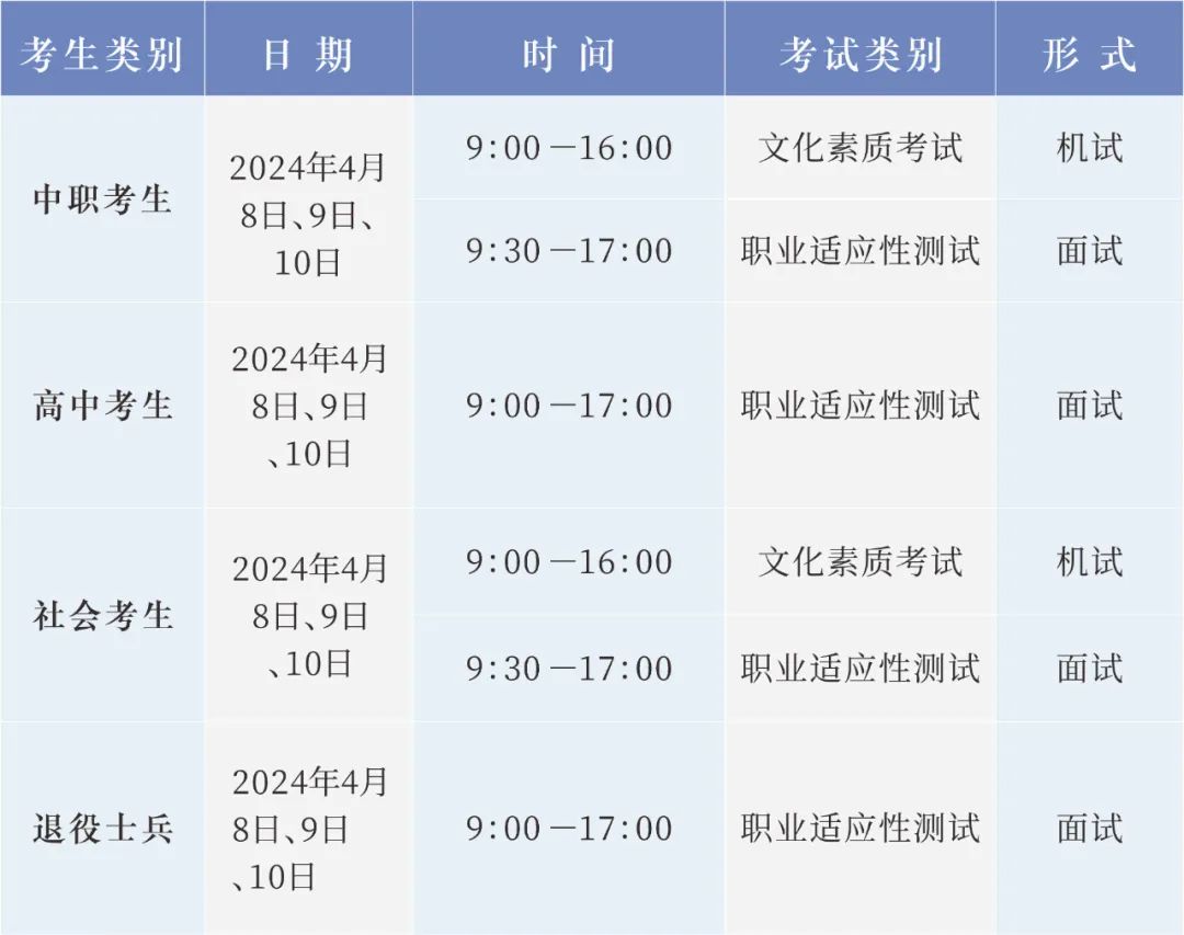 4 .退役士兵,须于规定时间内向报名所在地县(市、区)招生考试机构办 理手续通过后,可免除文化素质考试。退伍军人不进行文化素质考试,只参加职业适应性考试,总分300分。