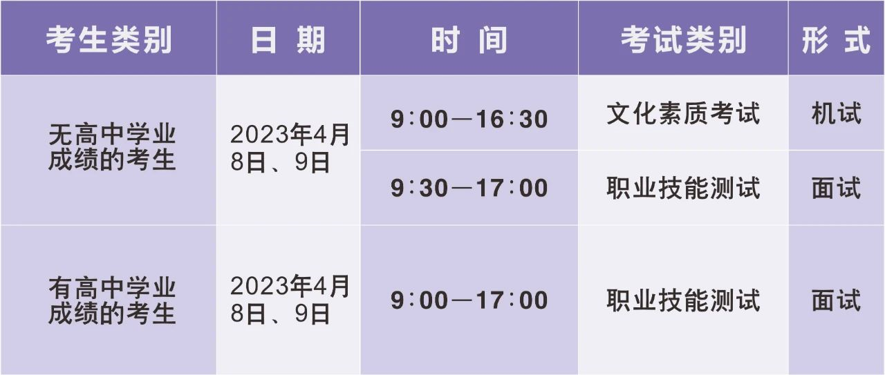 (二)考试方式及内容:考试采取“文化素质考试+职业技能测试”方式,其中文化素质考试采用上机考试,考试内容依据《中等职业学校公共基础课程标准》(主要包含语文、数学、英语、专业素质等),考生在规定的时间内随到随考,45分钟内完成考试。职业技能测试采用面试形式,测试内容结合学生报考专业特点,面试考查学生的专业能力、职业潜能、综合素养等。