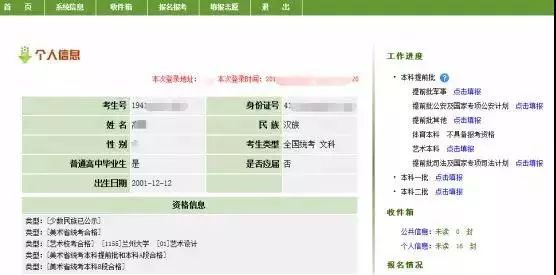 3、志愿保存成功,菜单“填报志愿”会变成“浏览志愿”,工作进度的“点击填报”会变成“点击查看”,同时,工作进度下方的收件箱-个人信息中会收到一条信息。