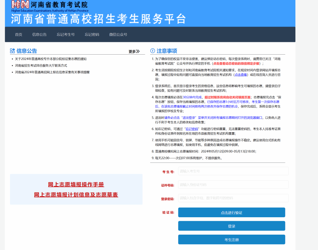 (1)详细阅读考生网上报名使用手册后,在考生登录区域输入考生的考生号、身份证号、密码和验证码,点击登录,登录普通高招服务平台。