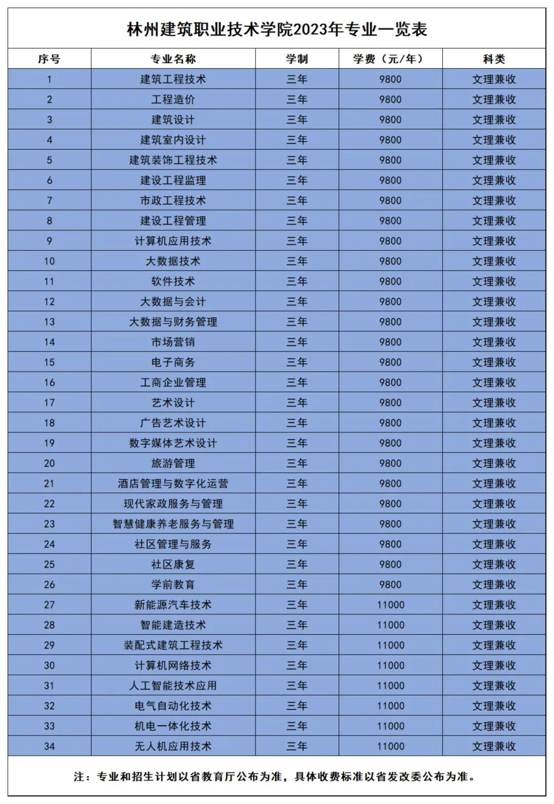 第十条 2023年学校组织全日制统招专科层次的招生录取工作,共招收三十四个专业,学制三年,分别是建筑工程技术、工程造价、建筑设计、建筑室内设计、建筑装饰工程技术、建设工程监理、市政工程技术、建设工程管理、计算机应用技术、大数据技术、软件技术、大数据与会计、大数据与财务管理、市场营销、电子商务、工商企业管理、艺术设计、广告艺术设计、数字媒体艺术设计、旅游管理、酒店管理与数字化运营、社区康复、社区管理与服务、现代家政服务与管理、智慧健康养老服务与管理、学前教育、新能源汽车技术、智能建造技术、装配式建筑工程技术、计算机网络技术、人工智能技术应用、电气自动化技术、机电一体化技术、无人机应用技术等。具体招生专业及计划以省招生主管部门批准公布为准。