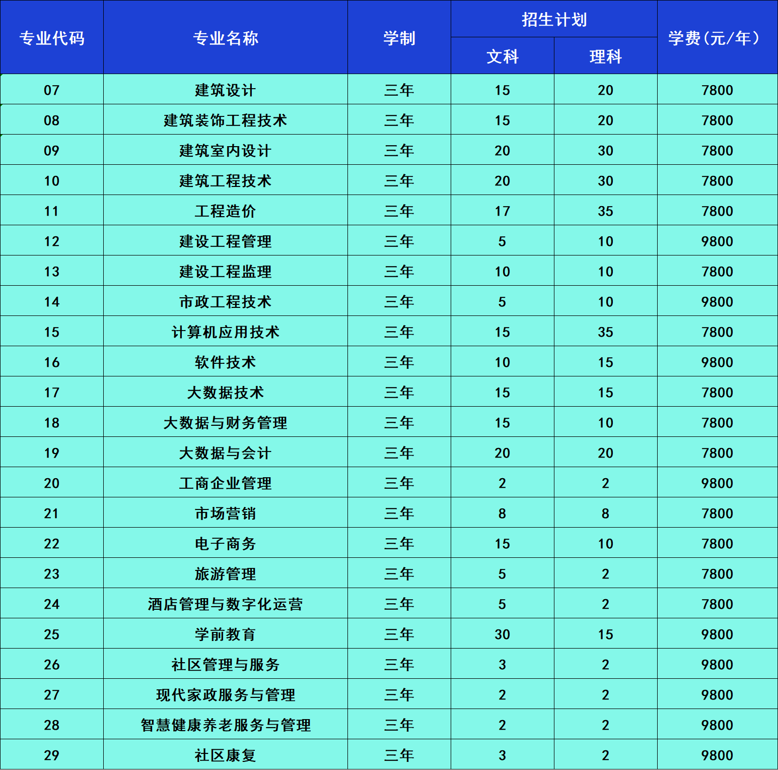 学院专业优势突出,特色鲜明,根据经济社会发展对人才的需求,适时开设建筑工程类、计算机通讯类、电子信息类、智能制造类、财经商贸类、艺术类、学前教育类、康养类等专业。学院将积极探索“校企合作–工学结合–项目导向”的人才培养模式,充分发挥林州“中国建筑之乡”的资源优势,实训进企业、模拟现场进学院、实训基地共建、学训同步等方式实施工学结合、产教融合,提升专业内涵建设水平和人才培养质量,形成专业优势和办学特色。