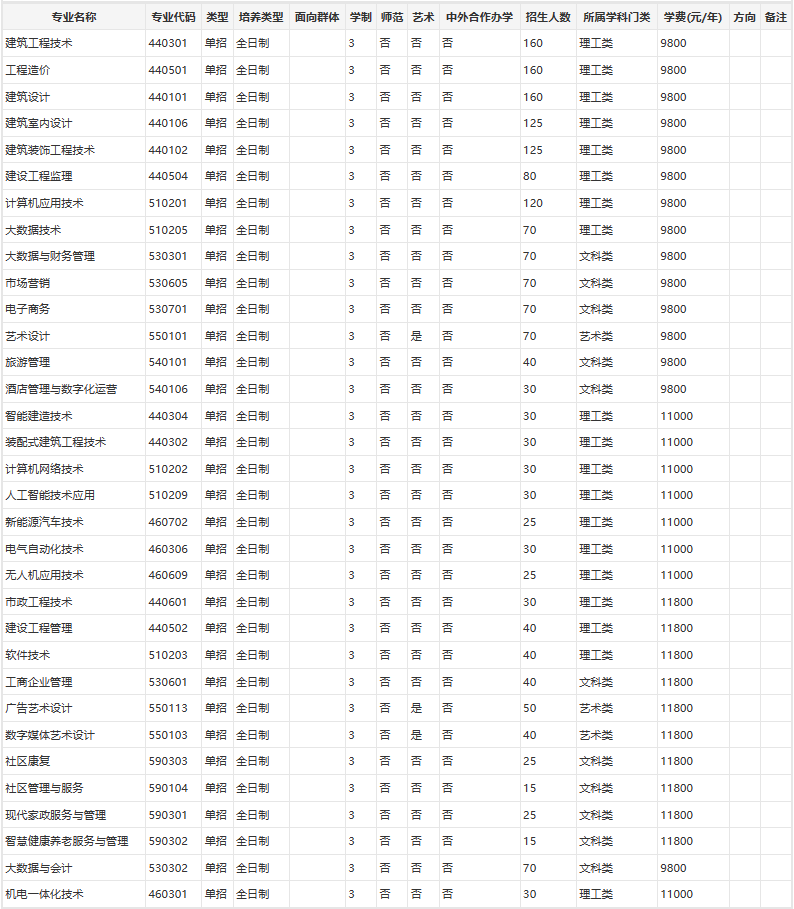 建筑工程技术、工程造价、建筑设计、建筑室内设计、建筑装饰工程技术、建设工程监理、计算机应用技术、大数据技术、大数据与会计、大数据与财务管理、市场营销、电子商务、艺术设计、旅游管理、酒店管理与数字化运营这十五个专业的收费标准如下: