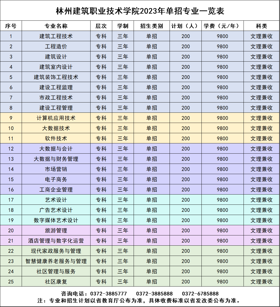 林州建筑职业技术学院(6359)2023年单招专业一览表