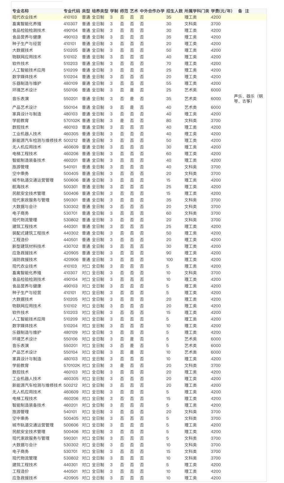 备注:以上专业均面向河南省招生,其中人工智能技术应用、新能源汽车检测与维修技术、乐器制造与维护专业同时面向河北省招生,智能制造装备技术、应急救援技术专业同时面向山东省招生。