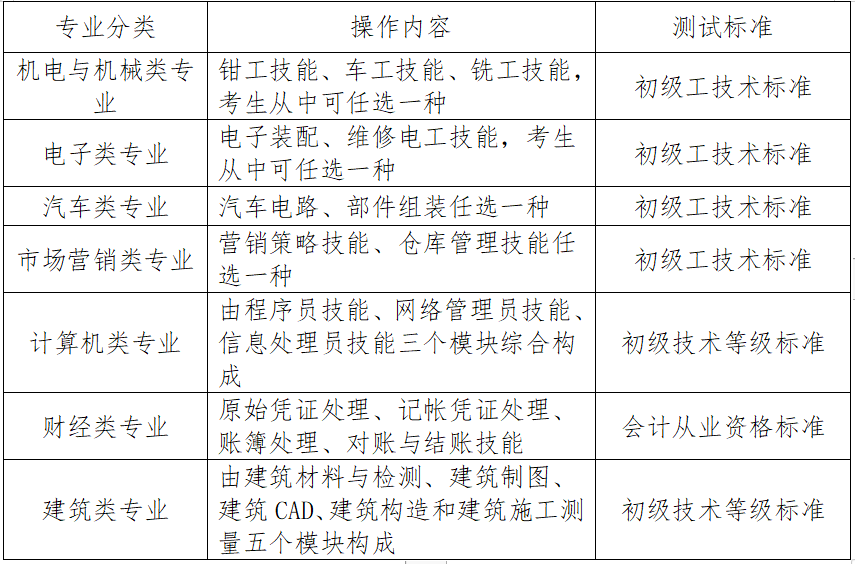 2.中职类考生:参加文化素质考试总分300分和职业技能测试总分300分,职业技能测试以《中等职业教育专业教学标准为依据》,测试相关内容、具体操作内容和测试标准见下表: