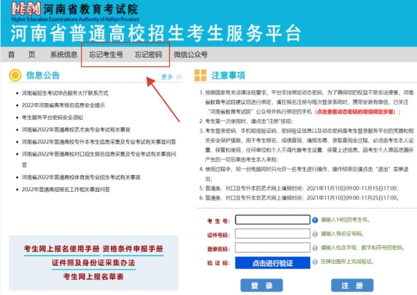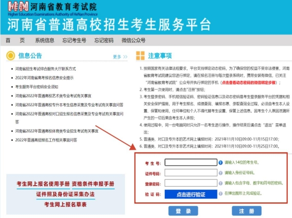 进入考生服务平台后,请仔细阅读“信息公告”区、“注意事项”区发布的政策公告和注意事项。