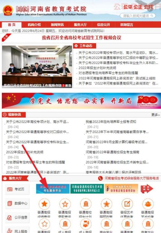 2、点击跳转进入河南省教育考试院官网,点击如下图示位置,进入“河南省普通高校招生考生服务平台”(https://pzwb.haeea.cn/)系统。
