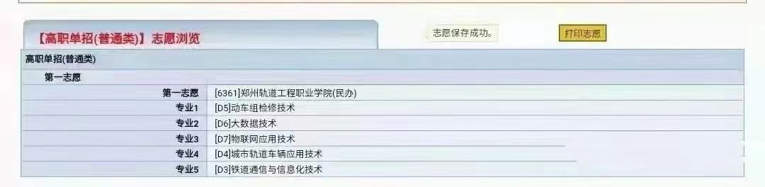 志愿保存成功后,系统自动跳转到志愿信息浏览页面,显示考生已经填报的志愿信息,考生可以点击打印按钮打印志愿信息。