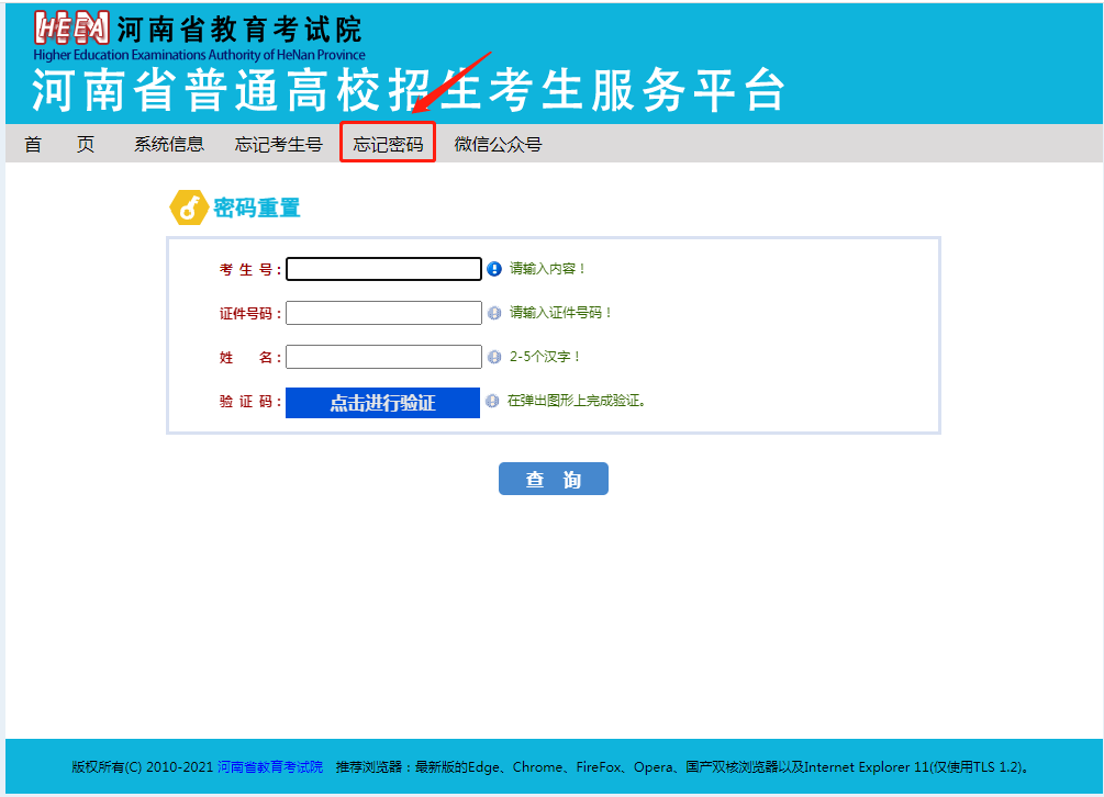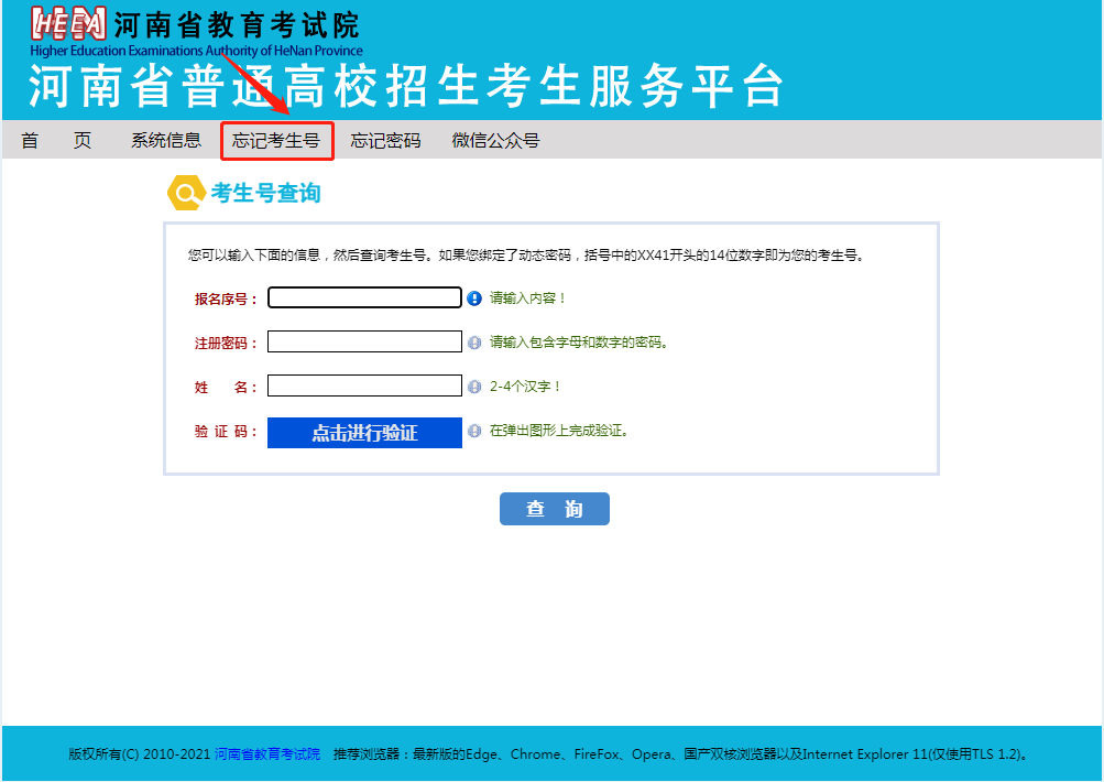 5、如果考生忘记自己的考生号和密码可以通过菜单栏的“忘记考生号”和“忘记密码”菜单项找回自己的考生号和重置自己的密码(找回考生号需要报名注册时的12位报名序号和注册密码,如果这些信息找不到,可以查看个人报名信息登记表,上面也有考生号,实在找不到请联系学校或老师)。如下图: