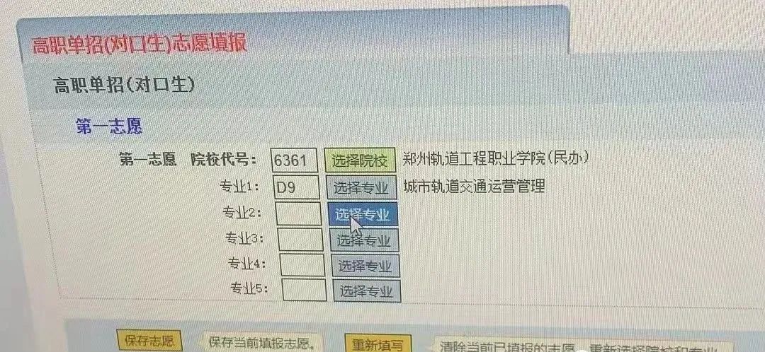 填写院校:输入【6361】郑州轨道工程职业学院院校代码,输入要填报的专业代号,系统会自动显示专业名称。