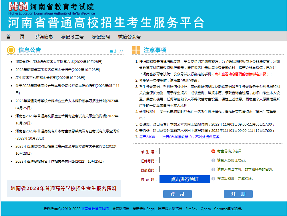3、进入考生服务平台后,请仔细阅读“信息公告”区、“注意事项”区发布的政策公告和注意事项。
