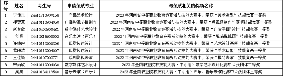 根据《河南省教育厅关于做好2024年高等职业教育单独考试招生和技能拔尖人才免试入学工作的通知》,我校对考生提交的免试入学材料进行审核并通过省教育厅备案,以下9人符合免试入学条件,特此公示: