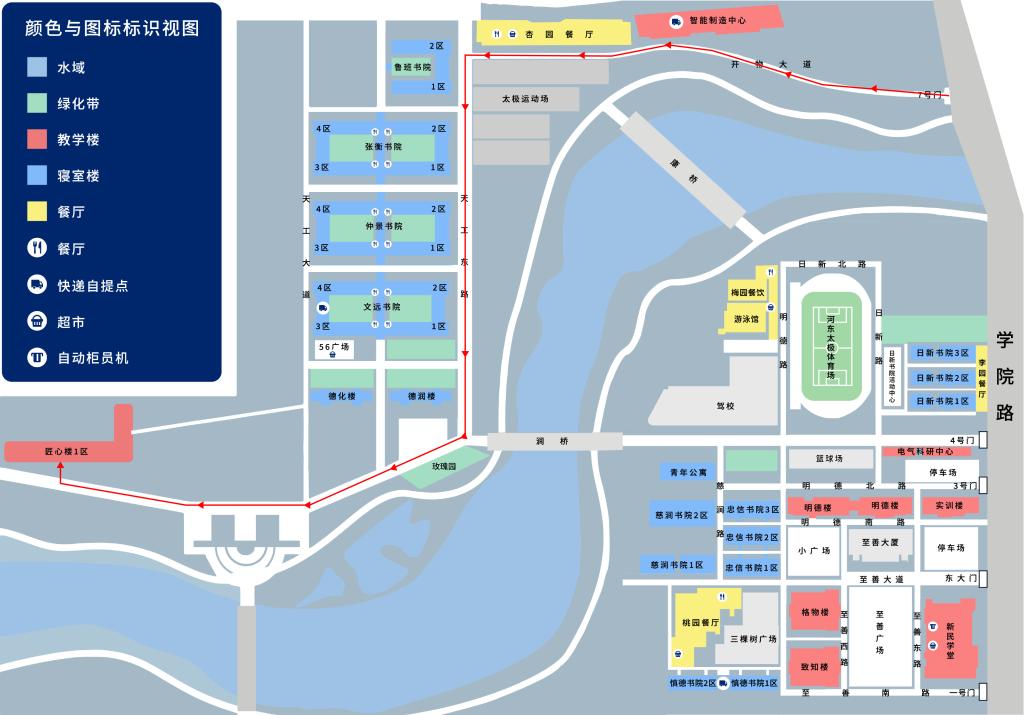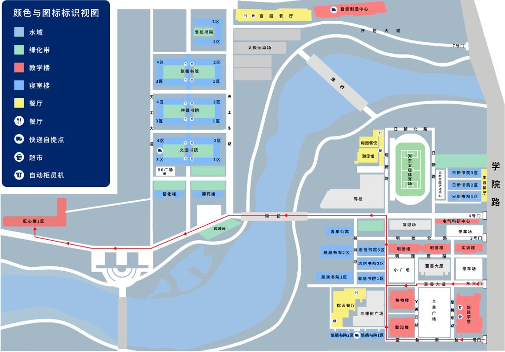 考试当天,考生可以根据情况,选择由河东校区一、东大门入校,或者由河西校区七号门入校。入校路线如下。