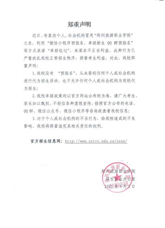 关于郑州旅游职业学院2021年单独招生的郑重声明