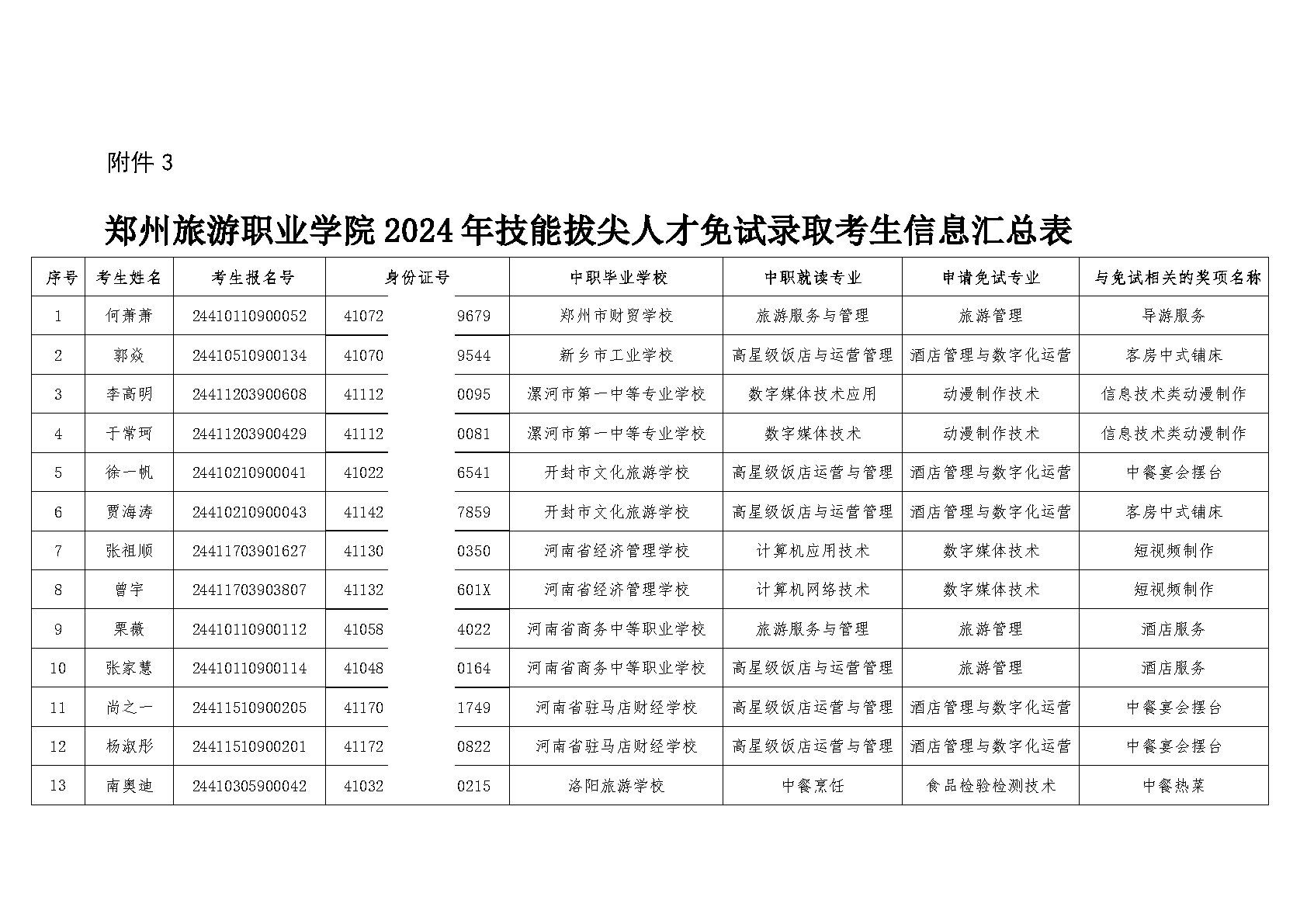 按照学校2024年单独招生章程规定的条件和流程,申请免试的技能拔尖考生提交了申请和证明材料,经在我校“单招招生系统”初审与现场审验,认定符合免试录取资格的考生共13名,现已全部完成省教育厅备案手续(具体信息查看图片)。