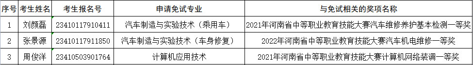 根据我校章程第十二条第2条:对于获得由教育部主办或联办的全国职业院校技能大赛三等奖及以上奖项,或由省级教育行政部门主办或联办的省级职业院校技能大赛一等奖的中职毕业生,和具有高级工或技师资格、获得县级劳动模范先进个人以上称号的在职在岗中职毕业生,可免试录取进入高校专科招生相同或相近专业学习。 现将符合免试条件的考生名单公示如下:
