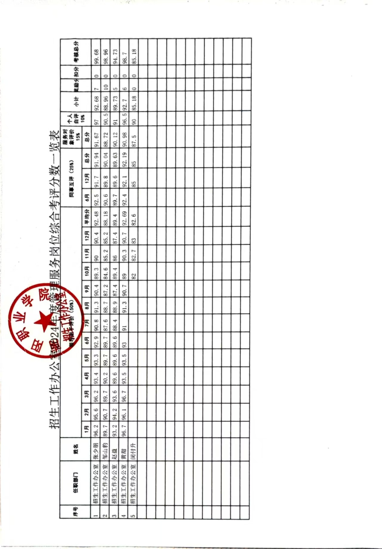 根据《南阳职业学院教职工年度绩效考核实施办法(试行)》(南职校〔2024〕13号)文件要求,我部门组织全体管理服务岗进行绩效考核工作。通过对照考核指标,实地看查资料等方式,现已核算出成绩,现公示如下: 公示期自2024年12月26日至2024年12月30日止(5个工作日),如有异议,可向招生办公室反映。联系地址:图书馆西侧招生办公室 联系电话:0377-60551111