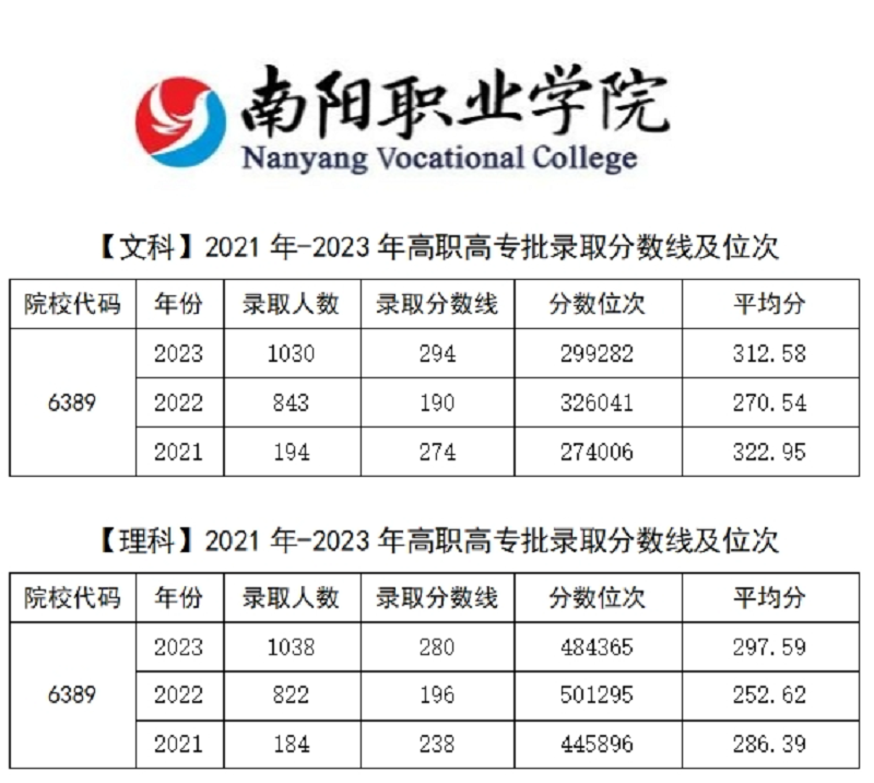 A:2023年我校在河南省高职高专批文科最低录取分数线294分,理科最低录取分数线280分。