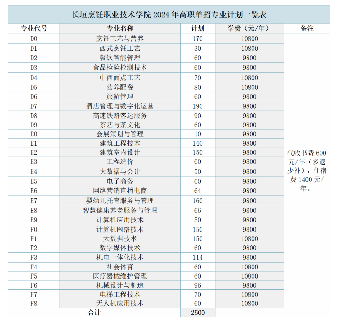 (1)餐饮智能管理、食品检验检测技术、旅游管理、酒店管理与数字化运营、高速铁路客运服务、茶艺与茶文化、会展服务与管理、建筑工程技术、建筑室内设计、工程造价、大数据与会计、电子商务、网络营销与直播电商、婴幼儿托育服务与管理、智慧健康养老服务与管理、计算机应用技术、计算机网络技术、数字媒体技术、机电一体化技术、机械设计与制造专业9800元/年/生;