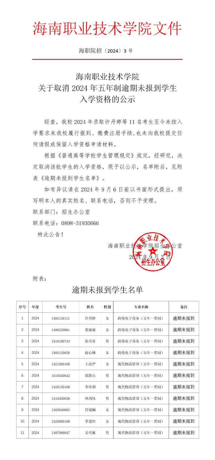 海职院招〔2024〕3号海南职业技术学院关于取消2024年五年制逾期未报到学生入学资格的公示