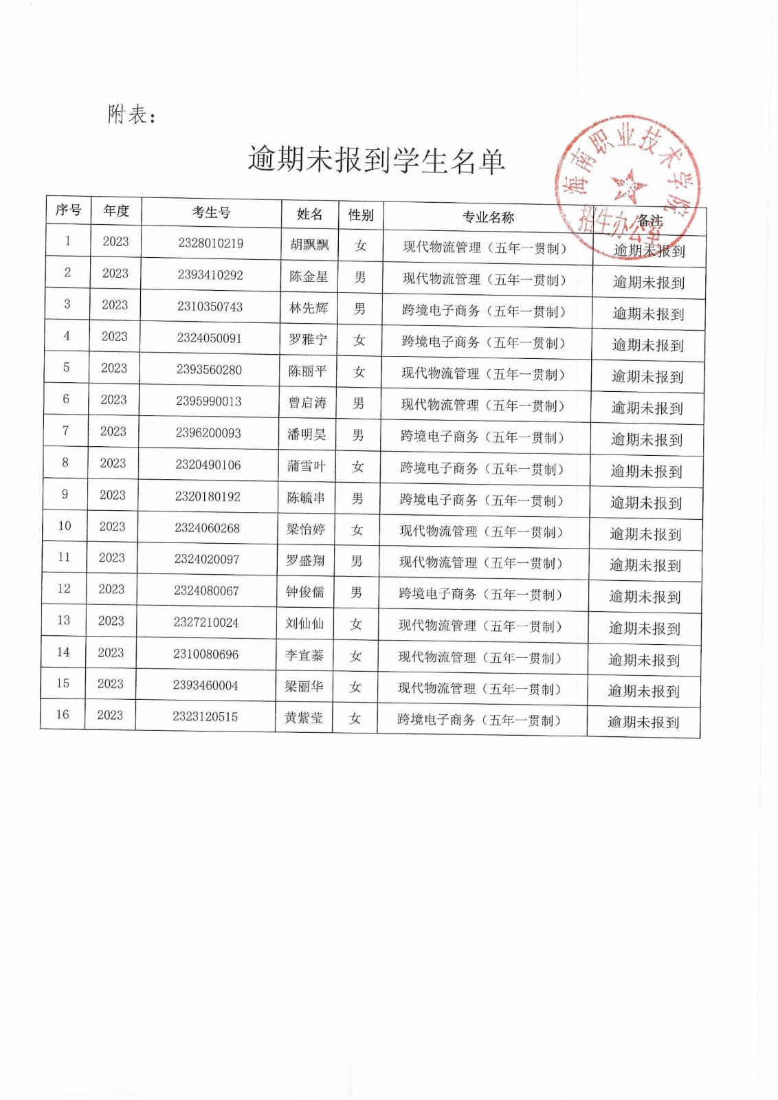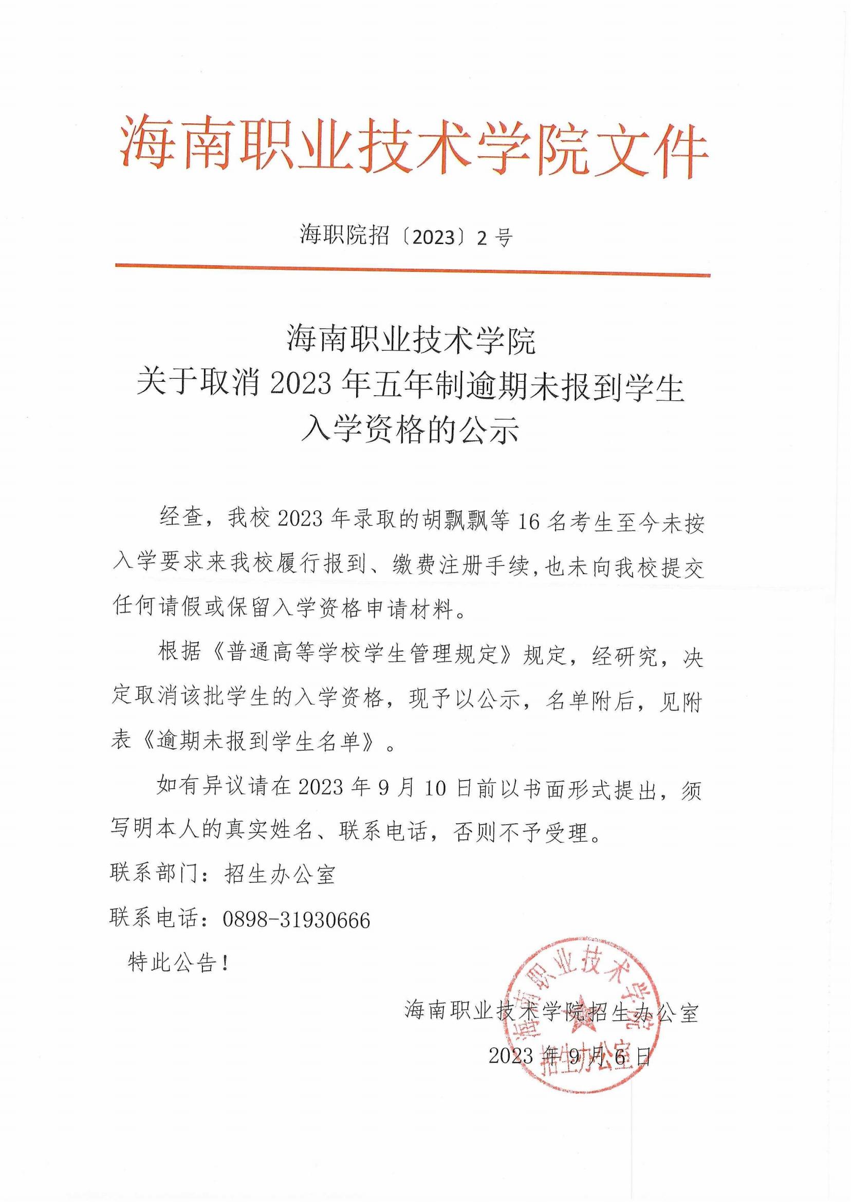 海职院招〔2023〕2号海南职业技术学院关于取消2023年五年制逾期未报到学生入学资格的公示