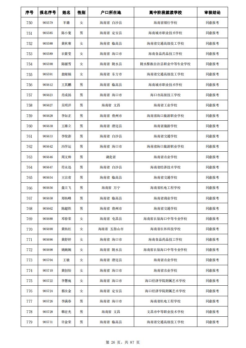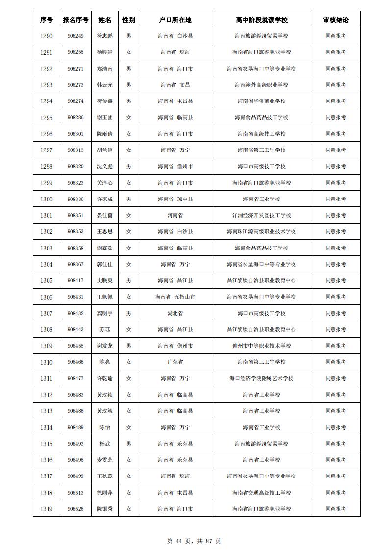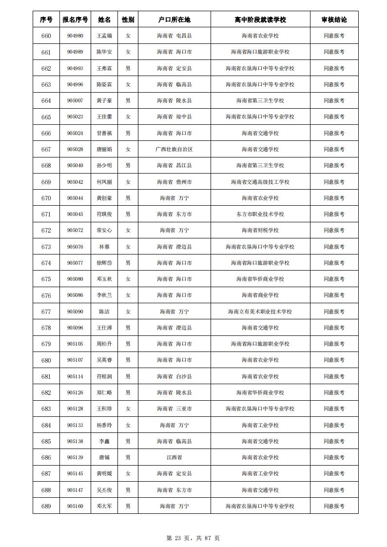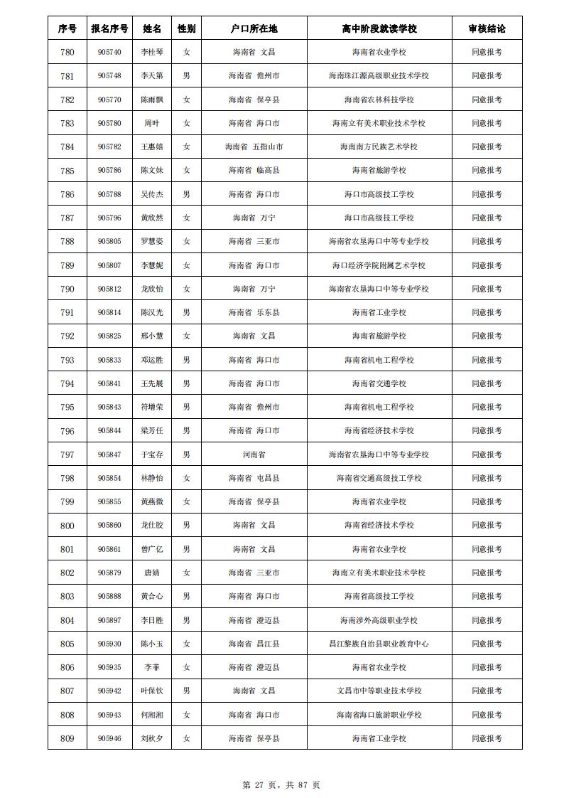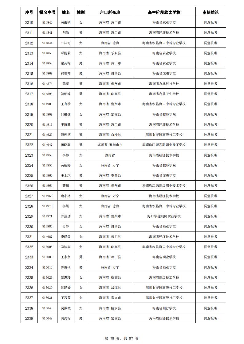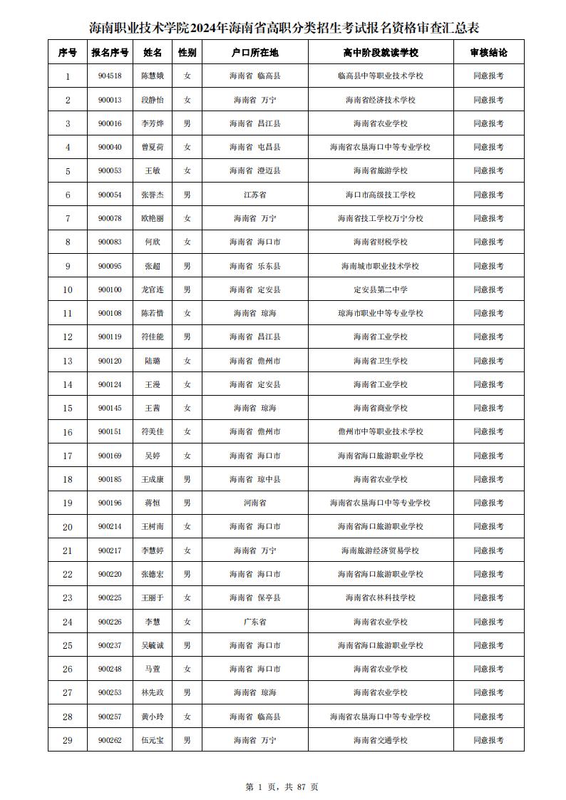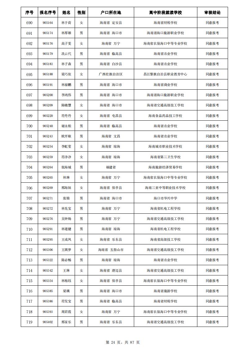 海南职业技术学院2024年海南省高职分类招生考试报名资格审查汇总表