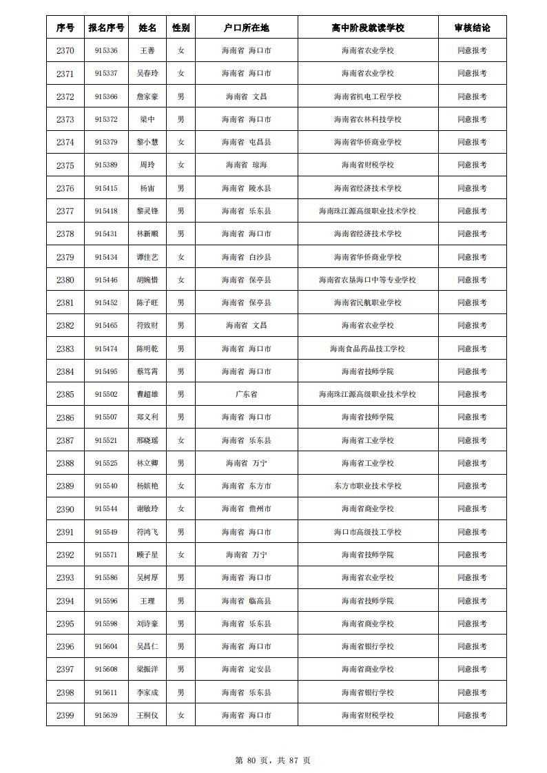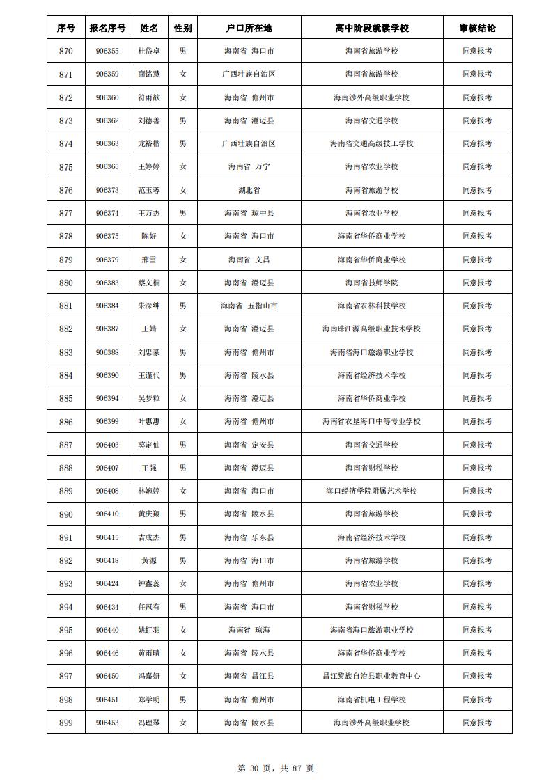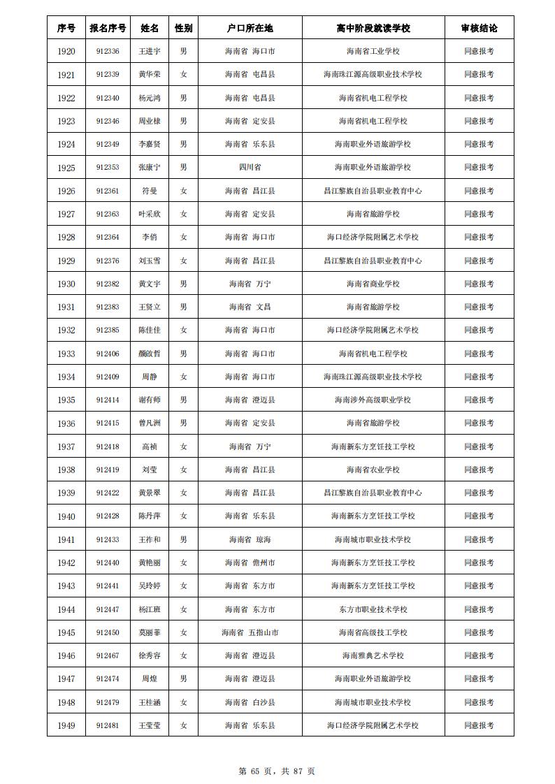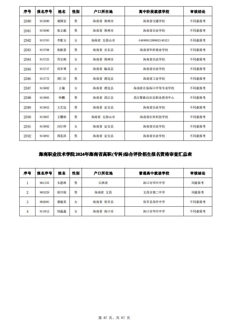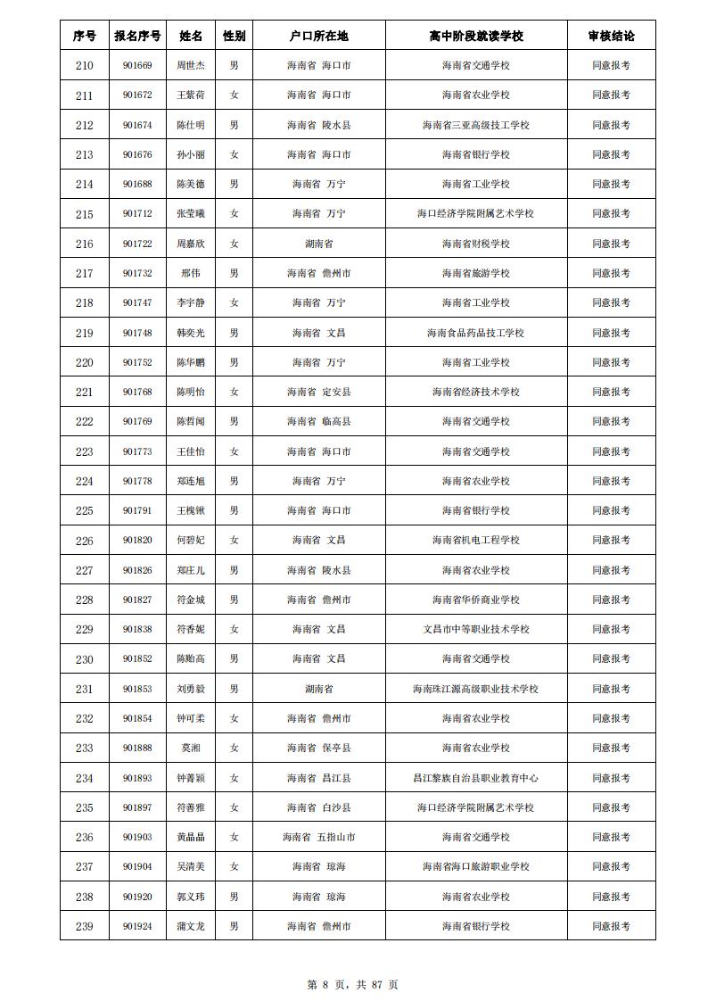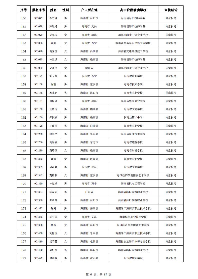 海南职业技术学院2024年海南省高职分类招生考试报名资格审查汇总表