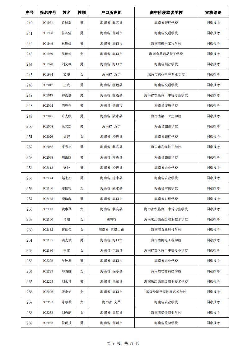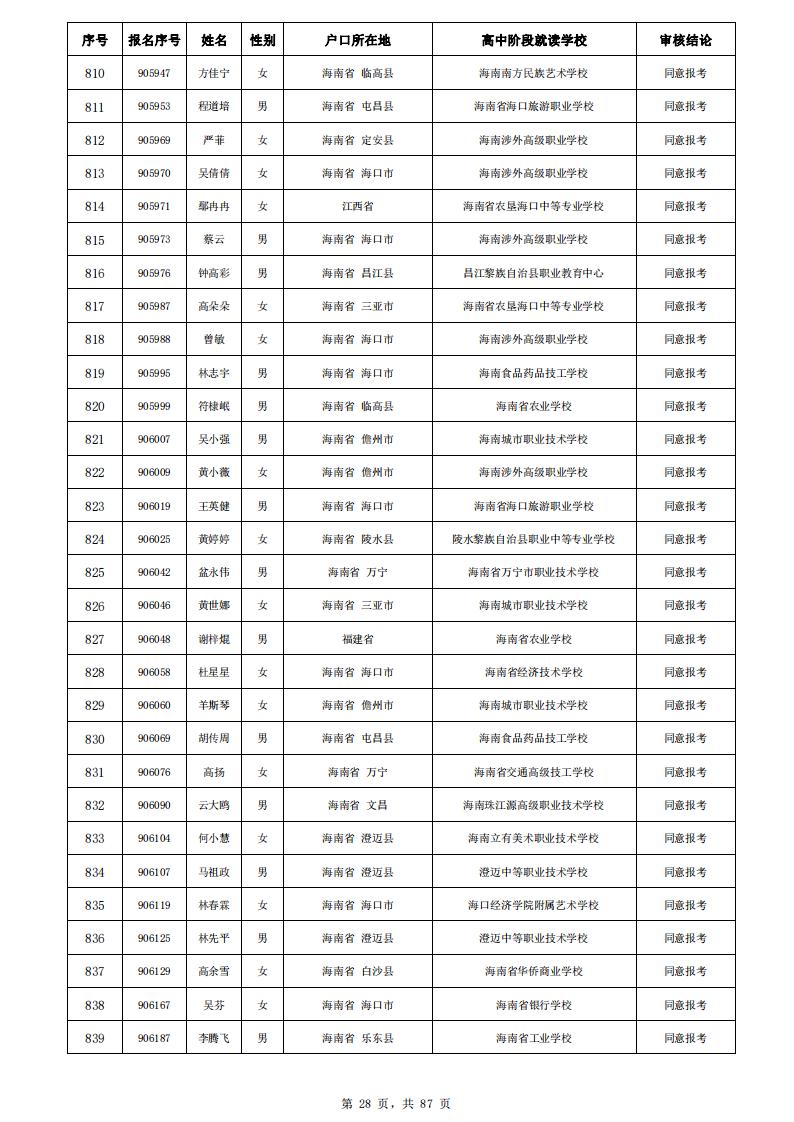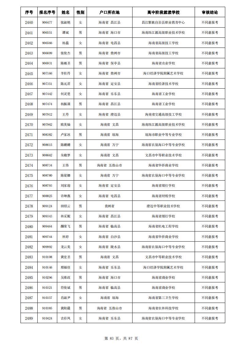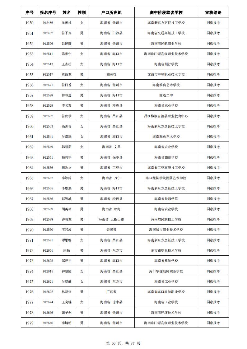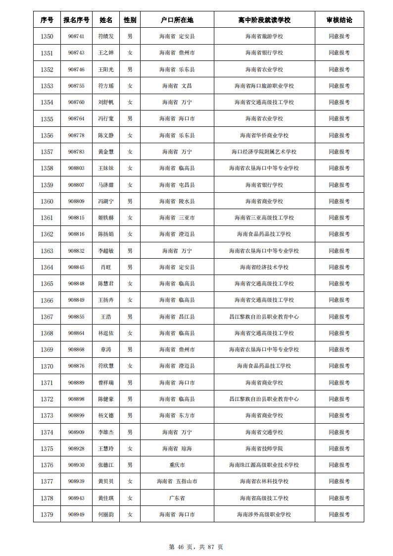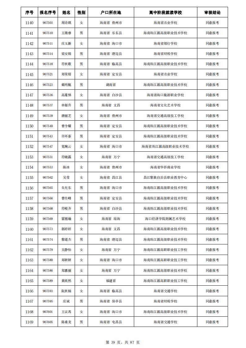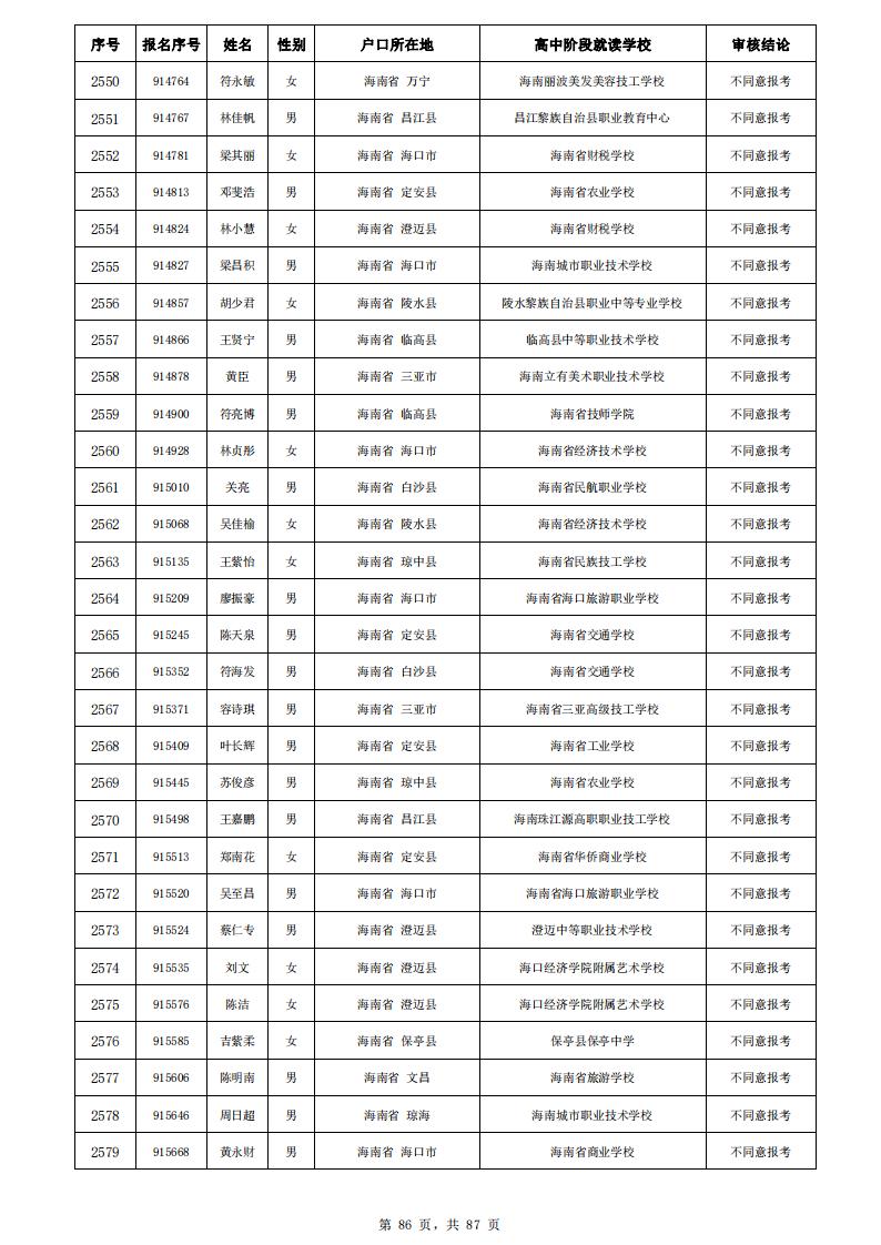 海南职业技术学院2024年海南省高职分类招生考试报名资格审查汇总表