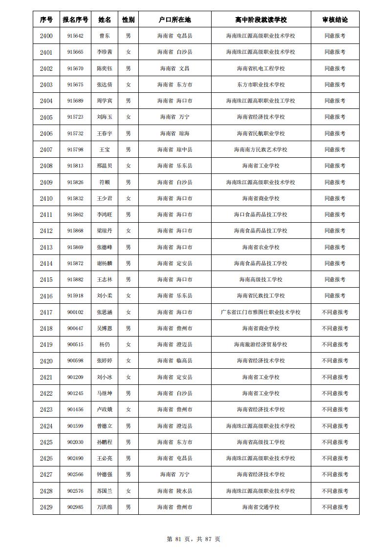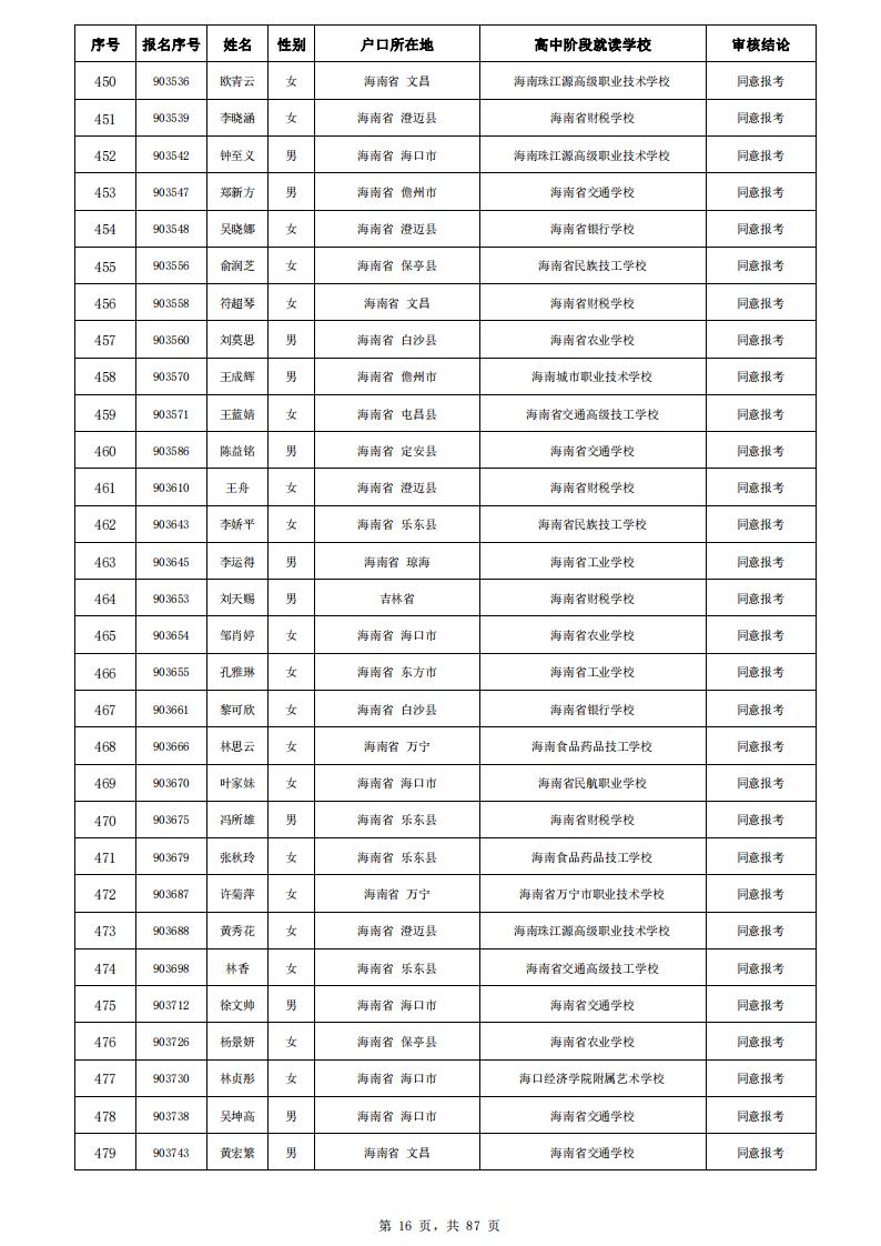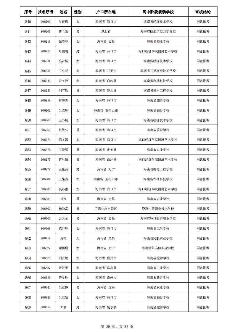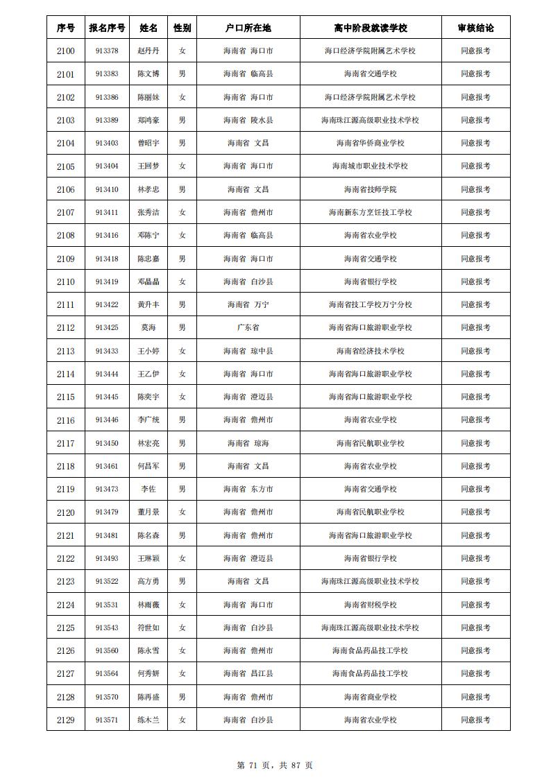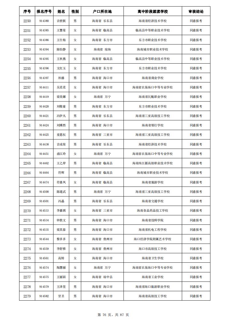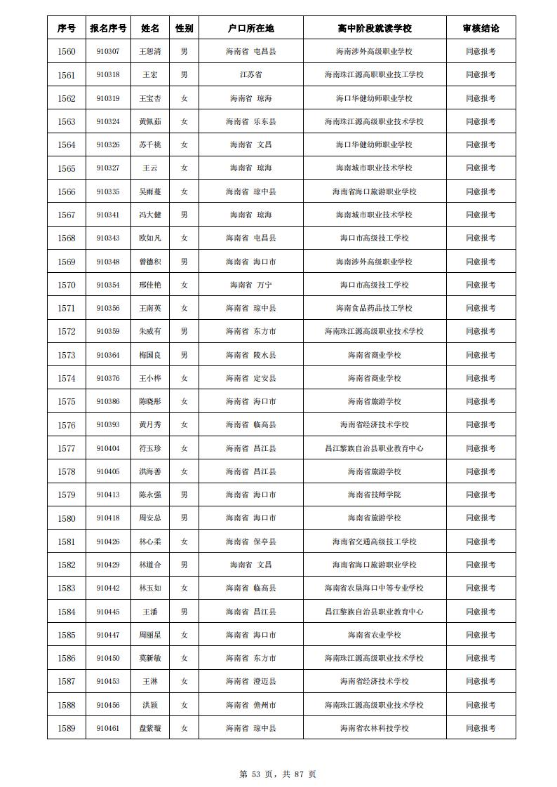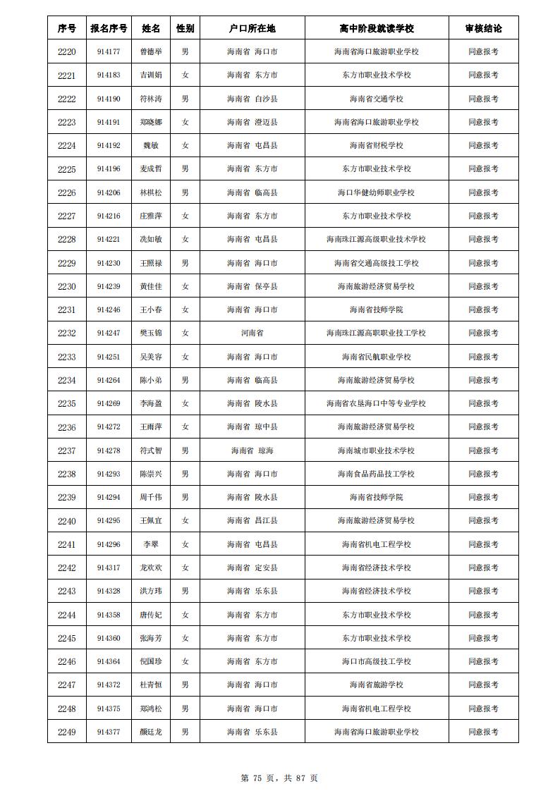 海南职业技术学院2024年海南省高职分类招生考试报名资格审查汇总表