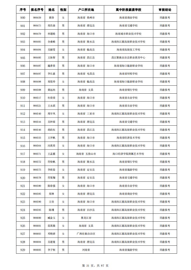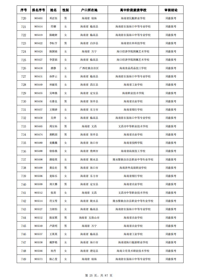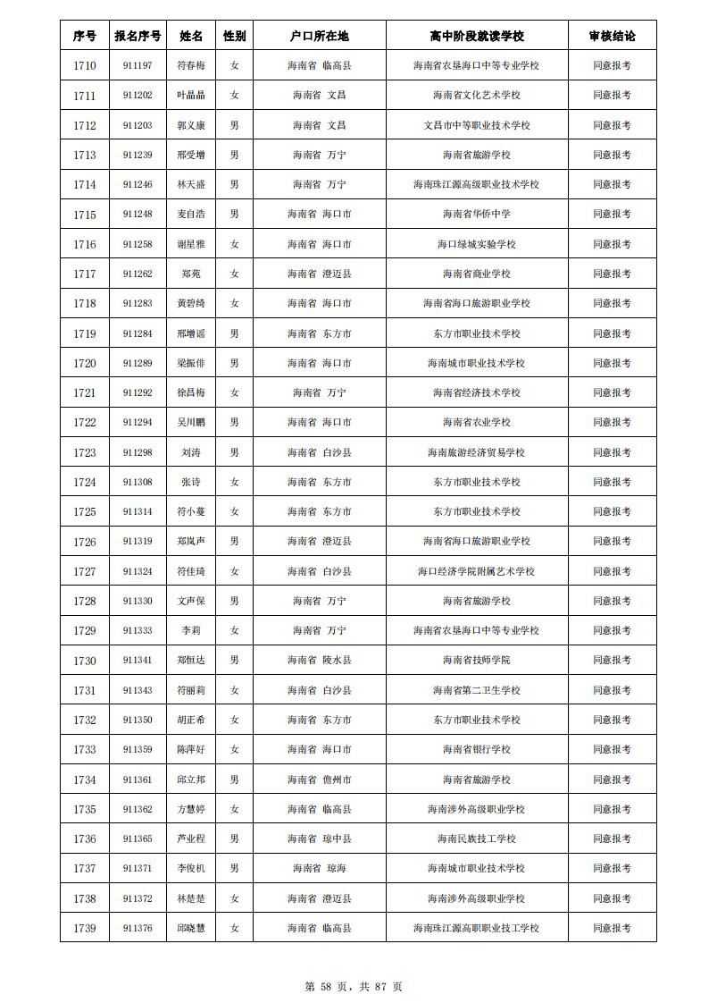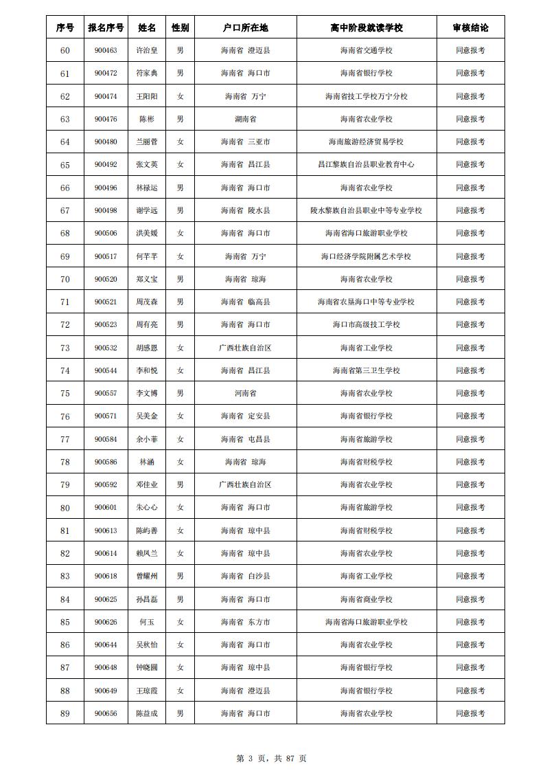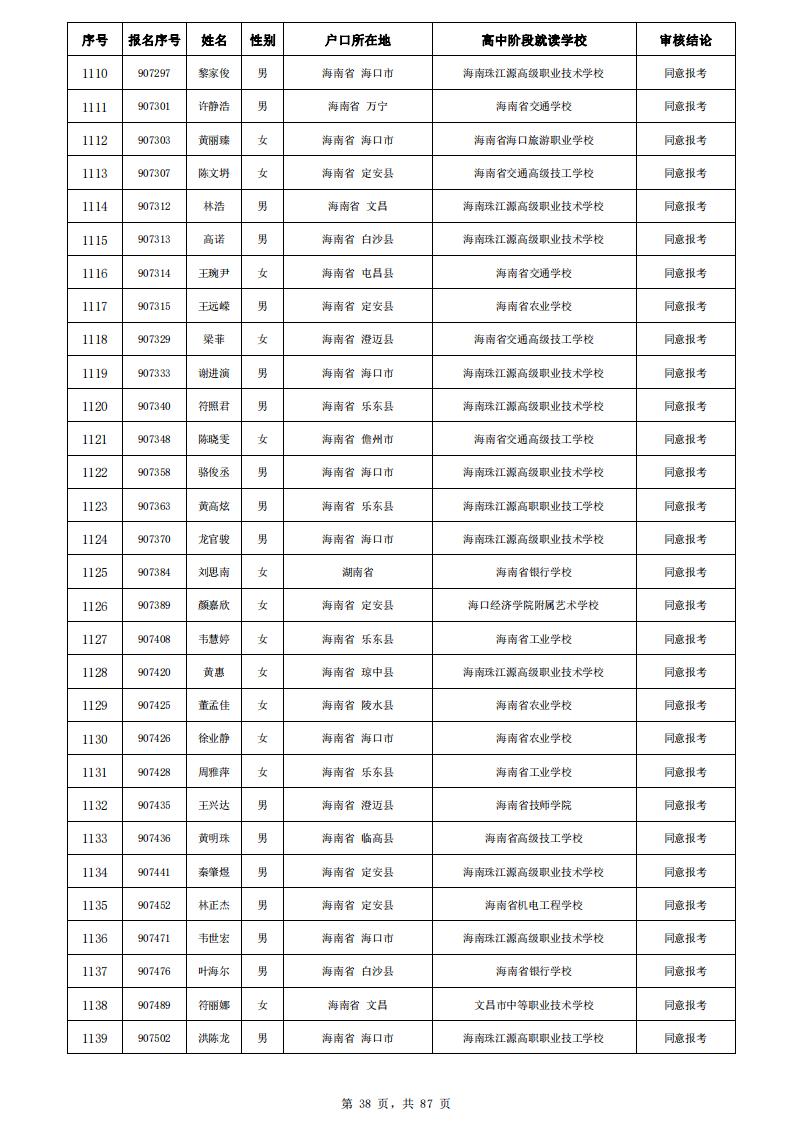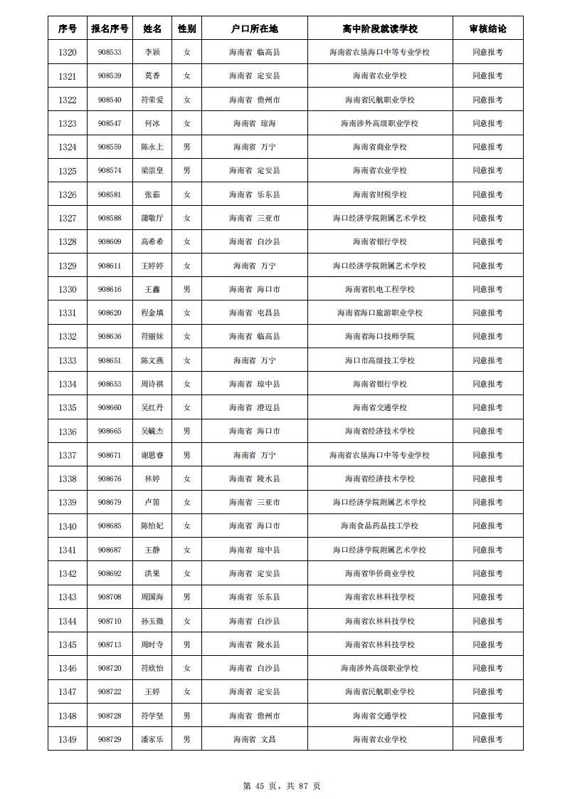 海南职业技术学院2024年海南省高职分类招生考试报名资格审查汇总表