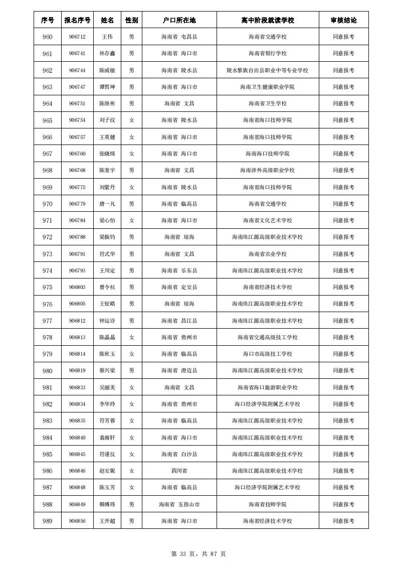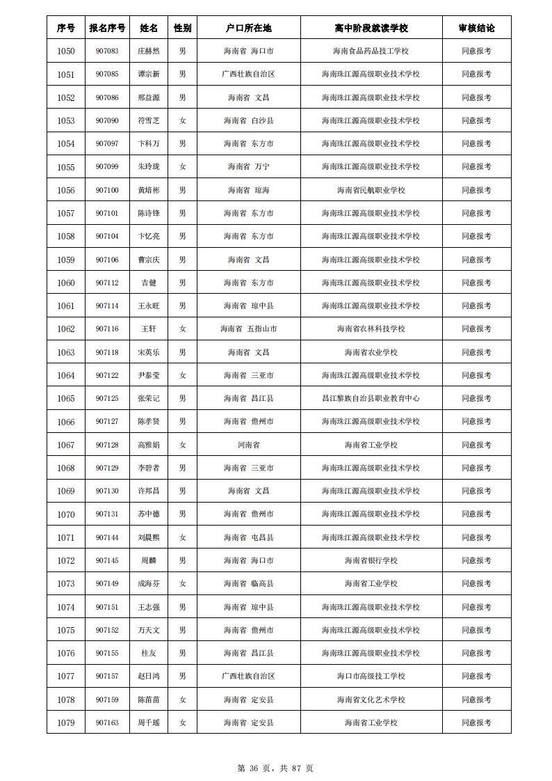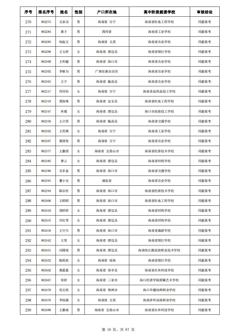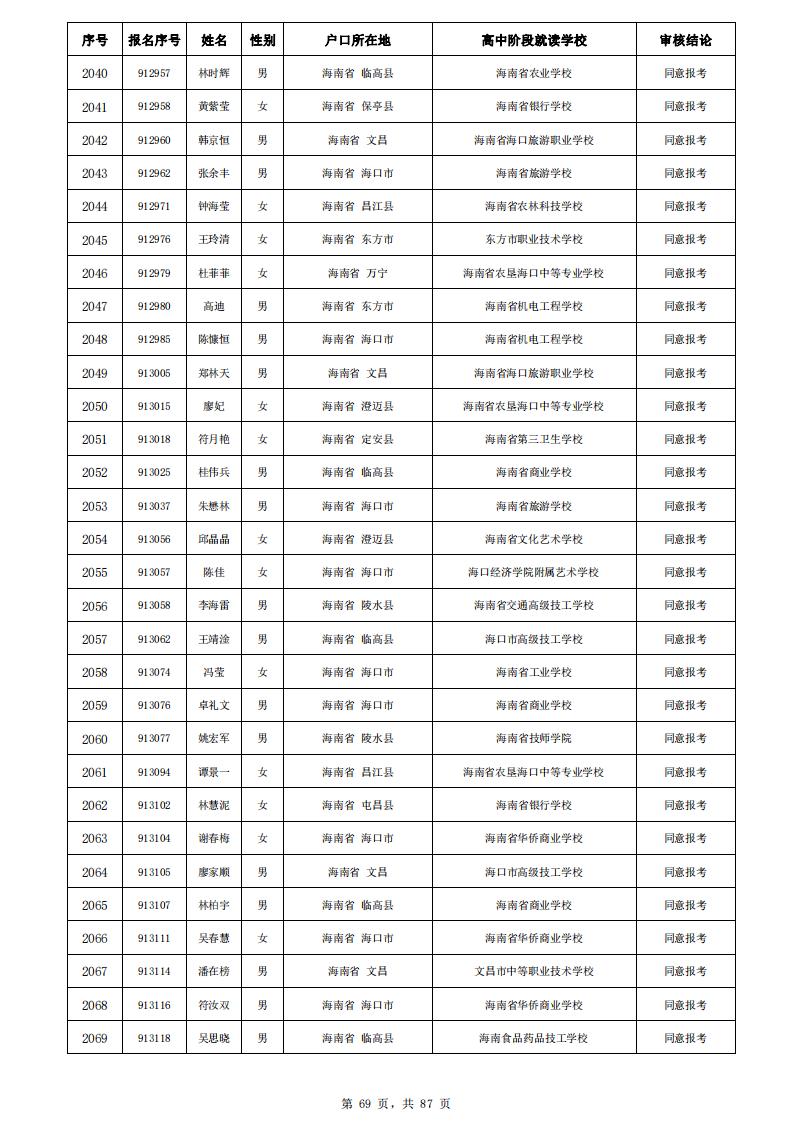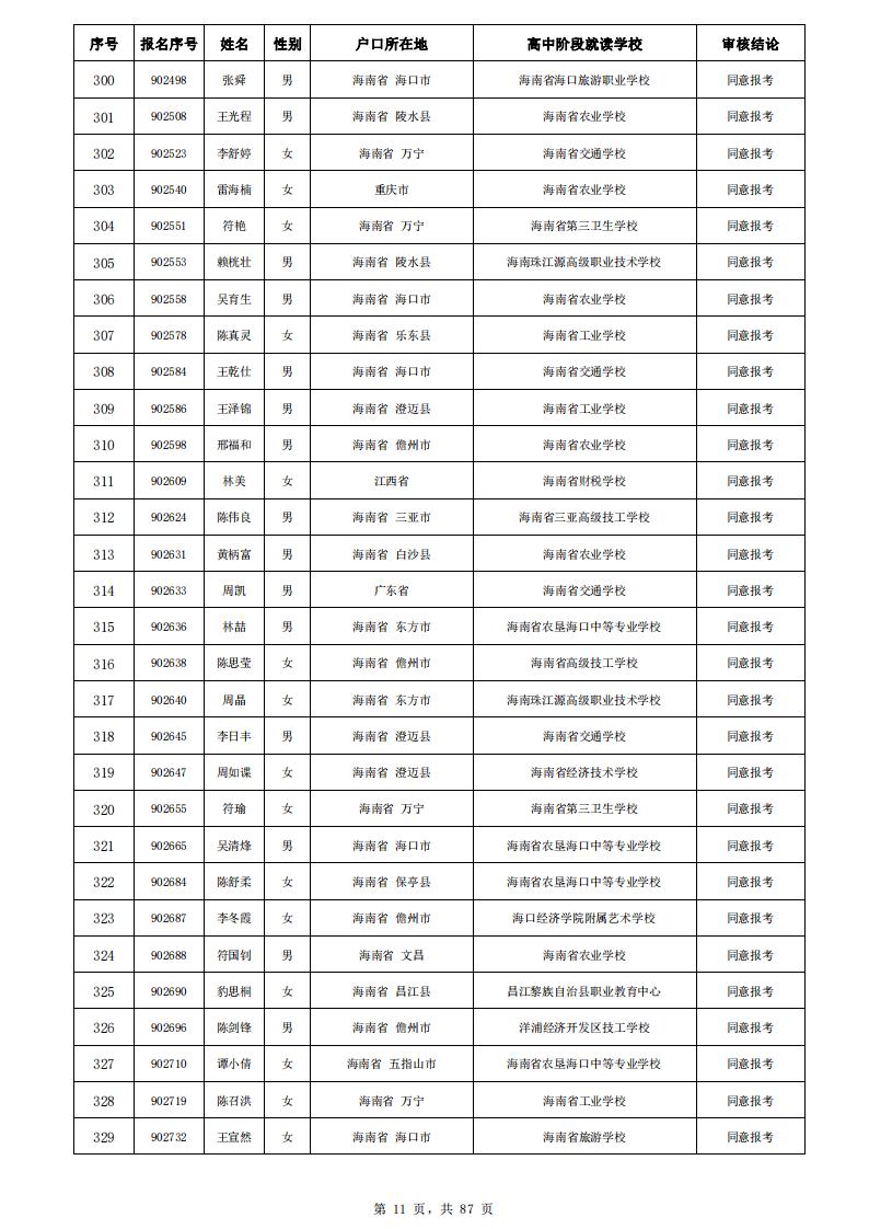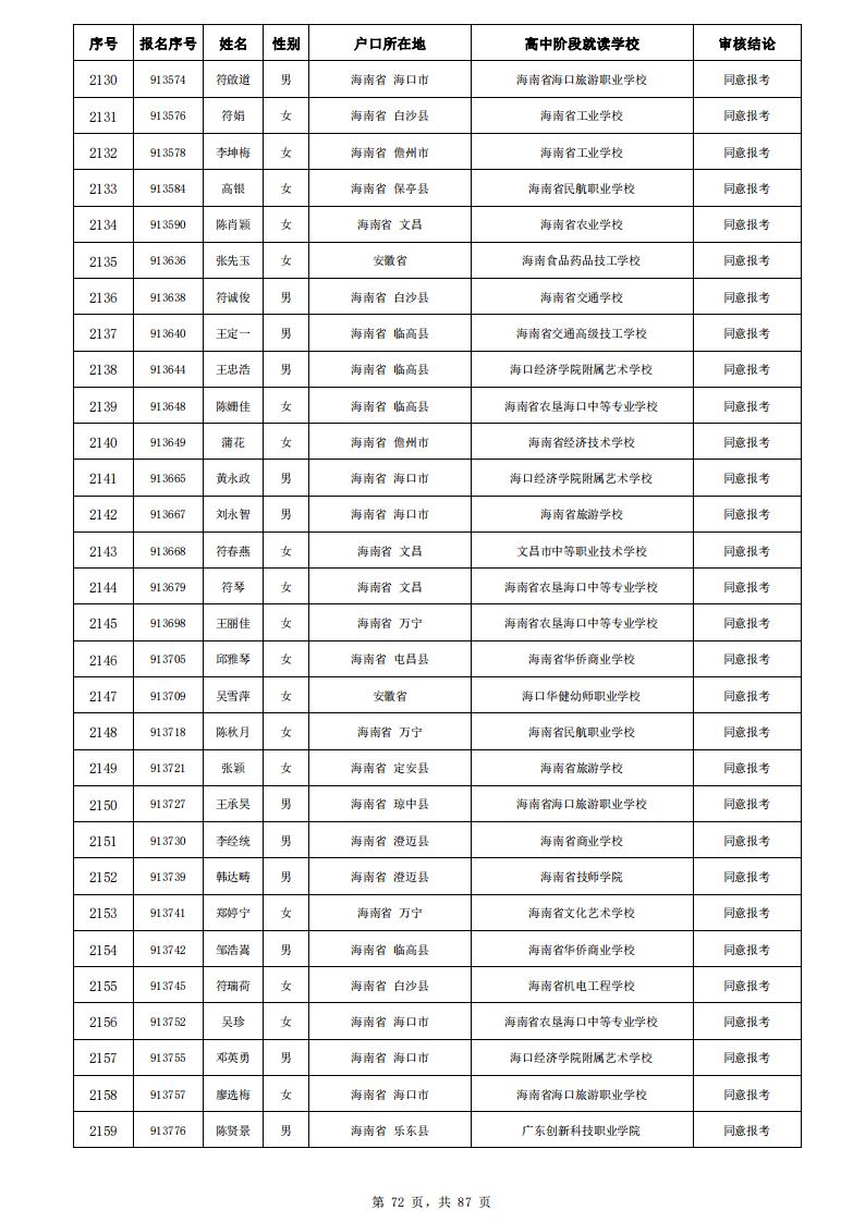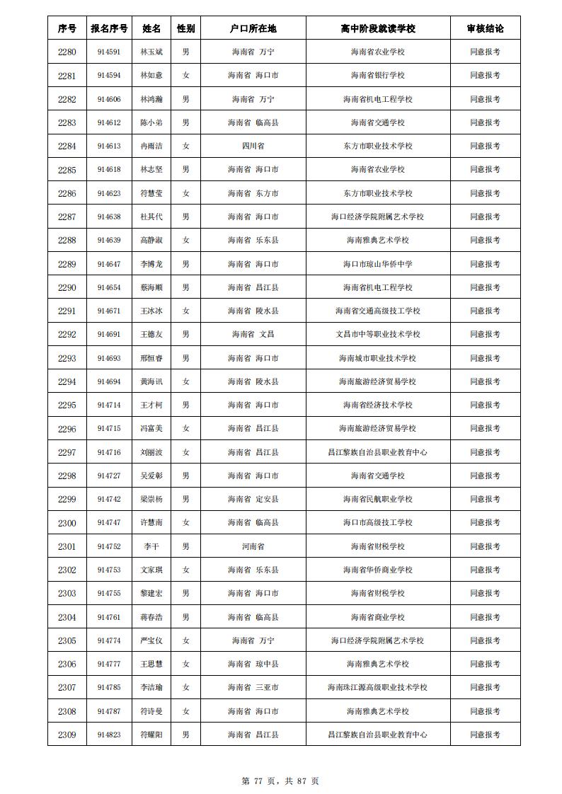海南职业技术学院2024年海南省高职分类招生考试报名资格审查汇总表