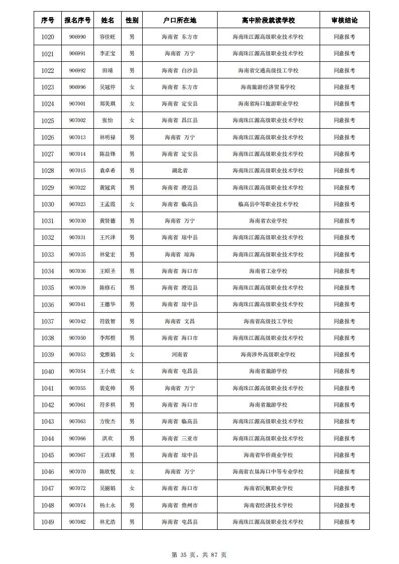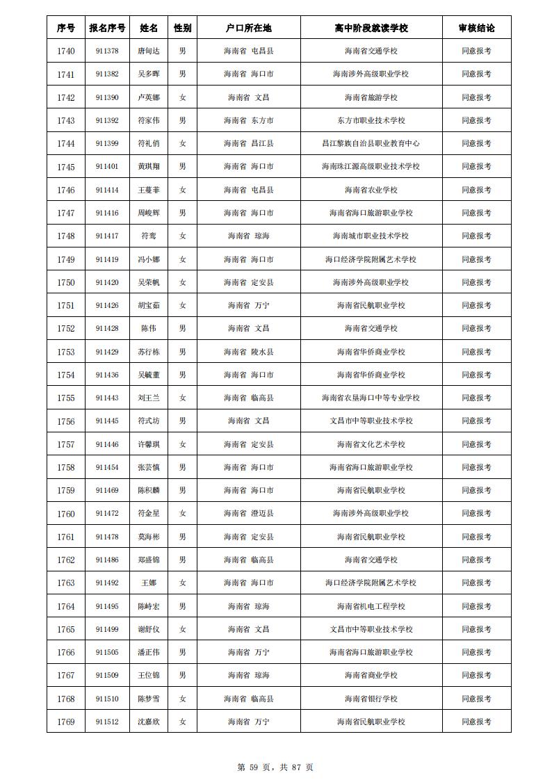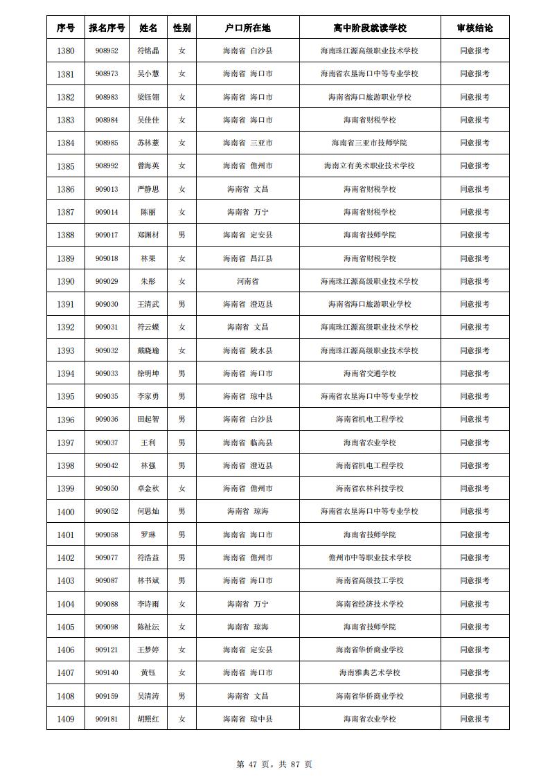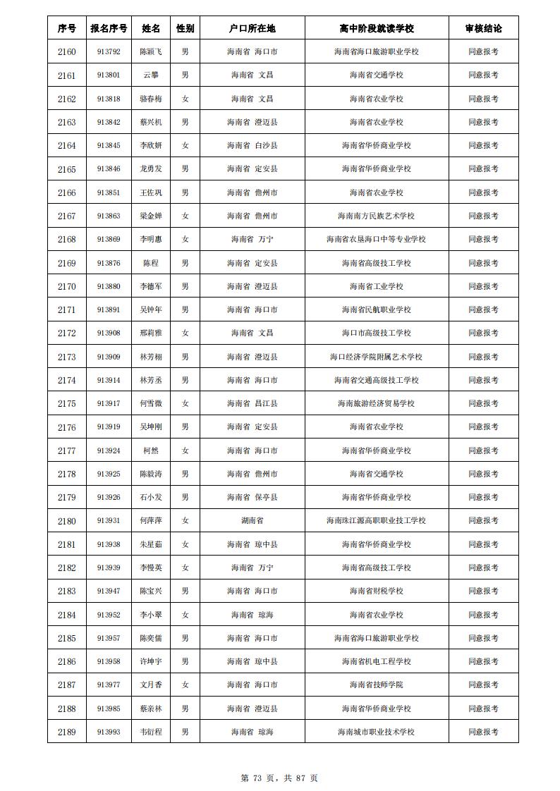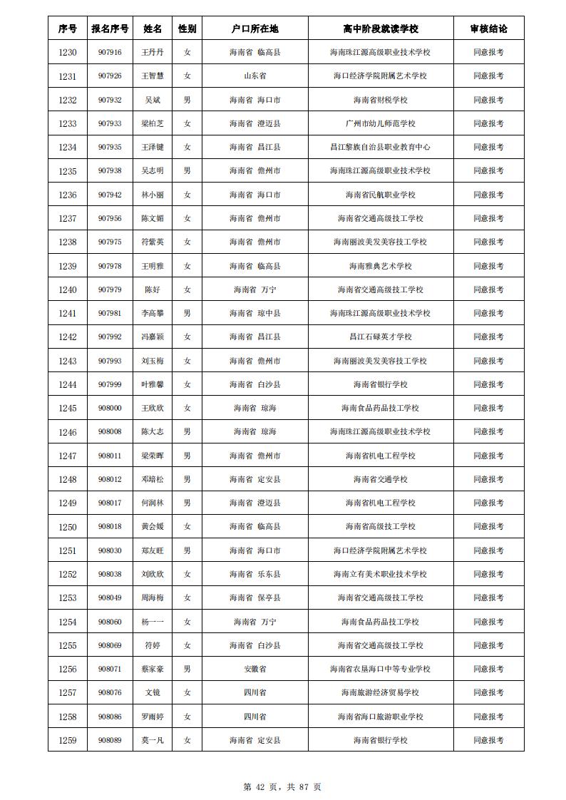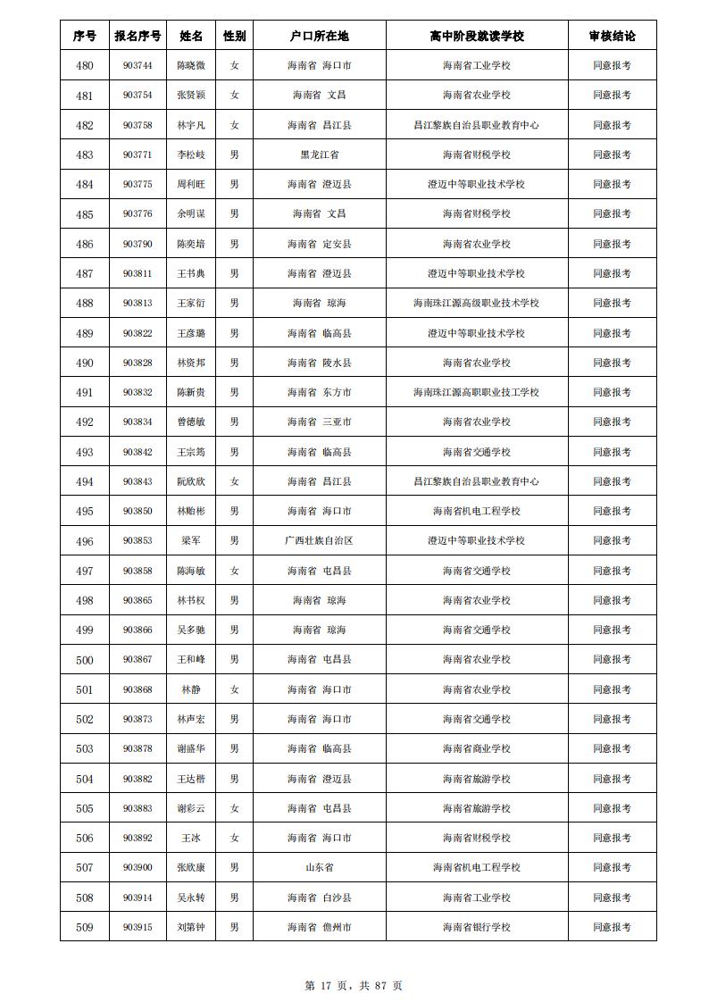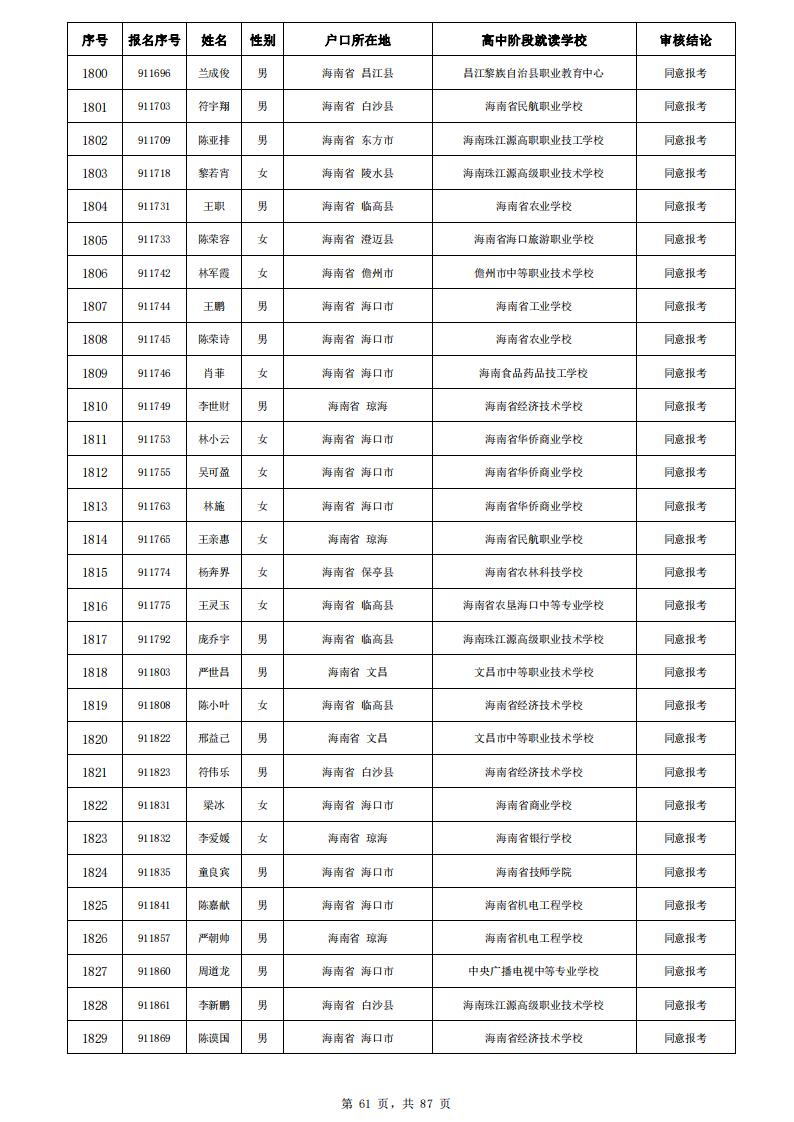 海南职业技术学院2024年海南省高职分类招生考试报名资格审查汇总表
