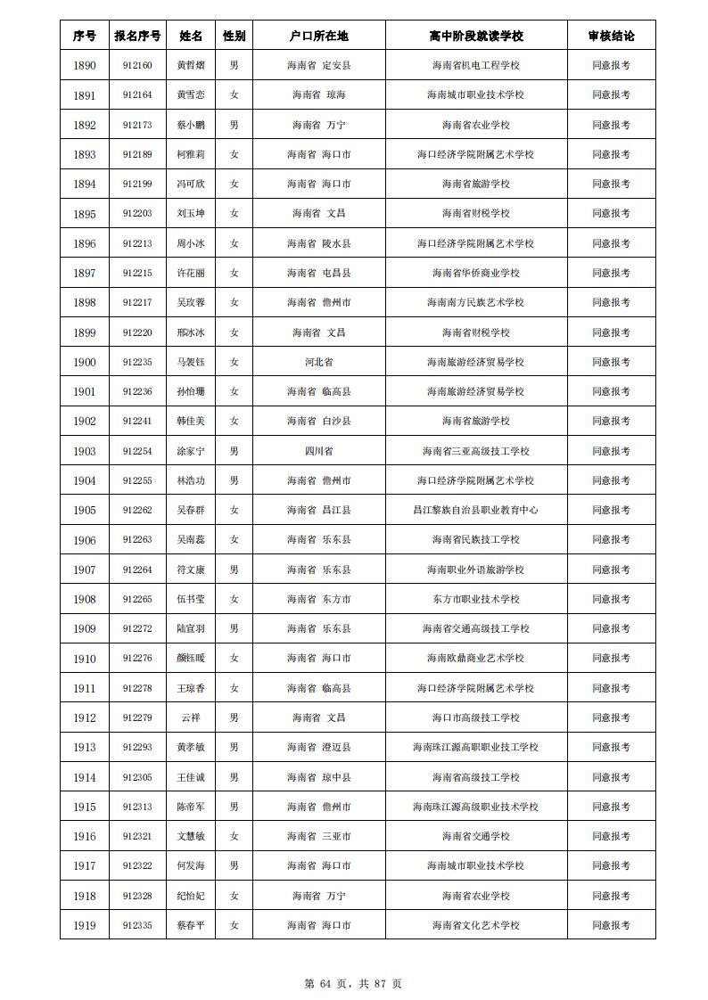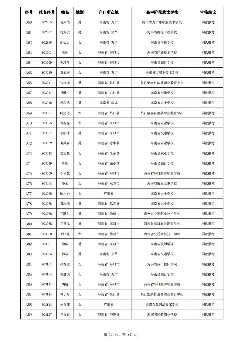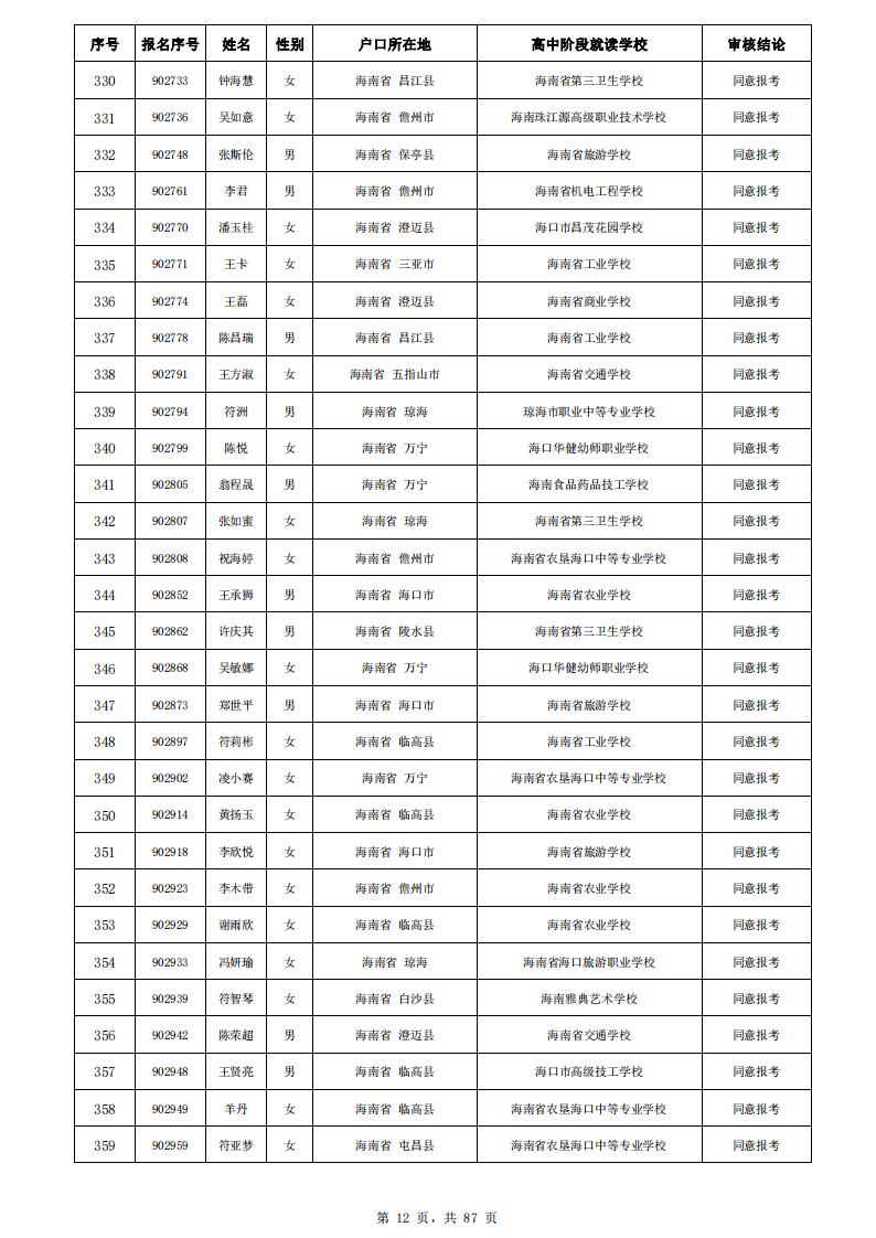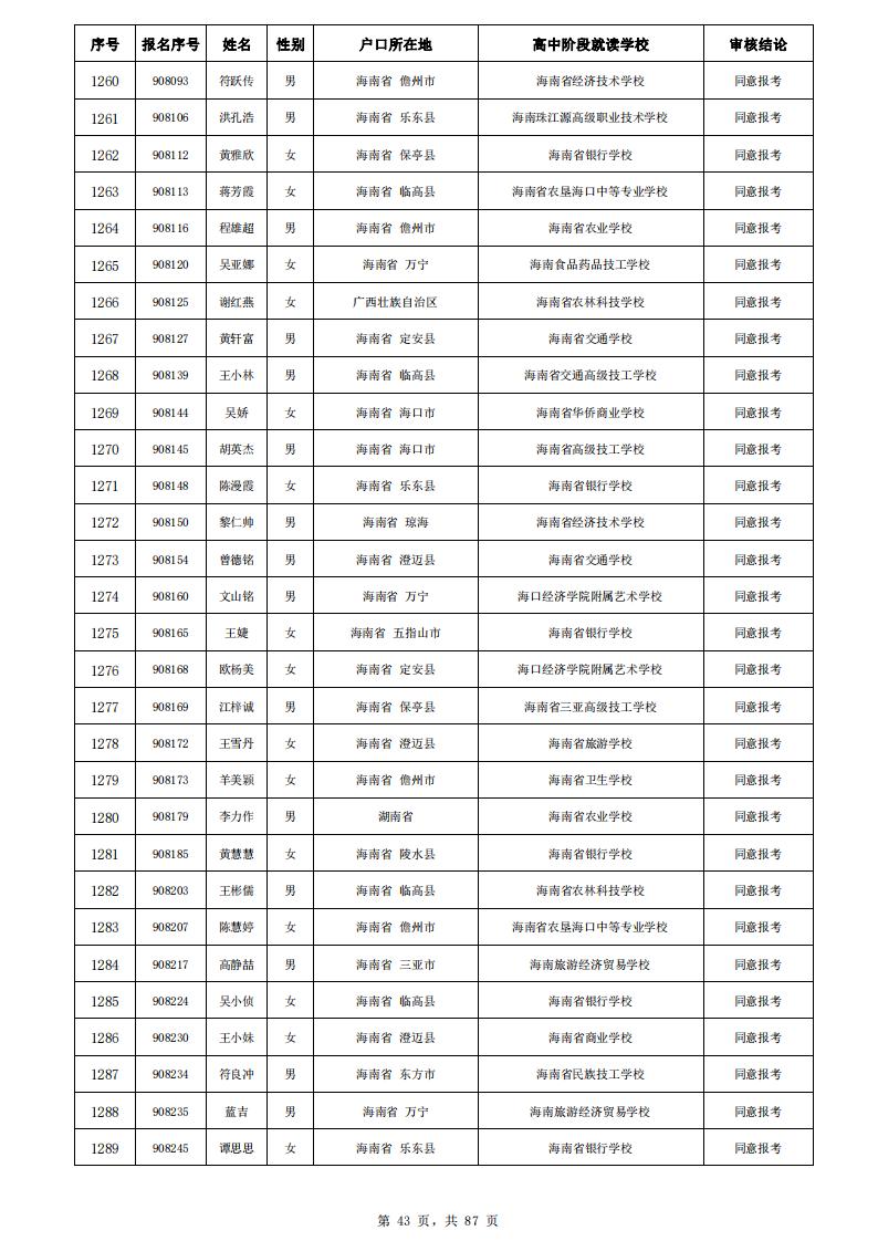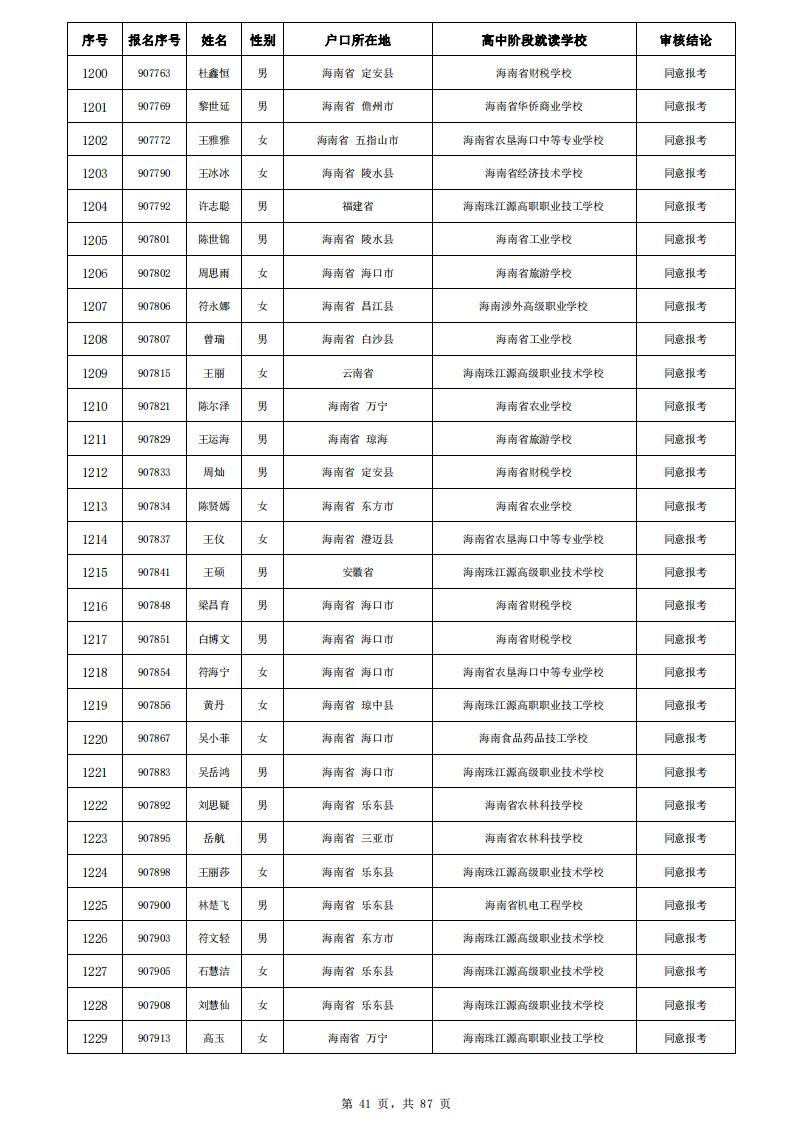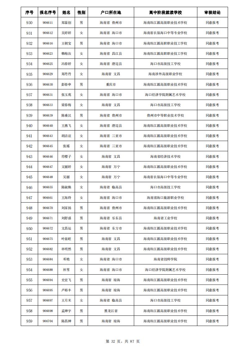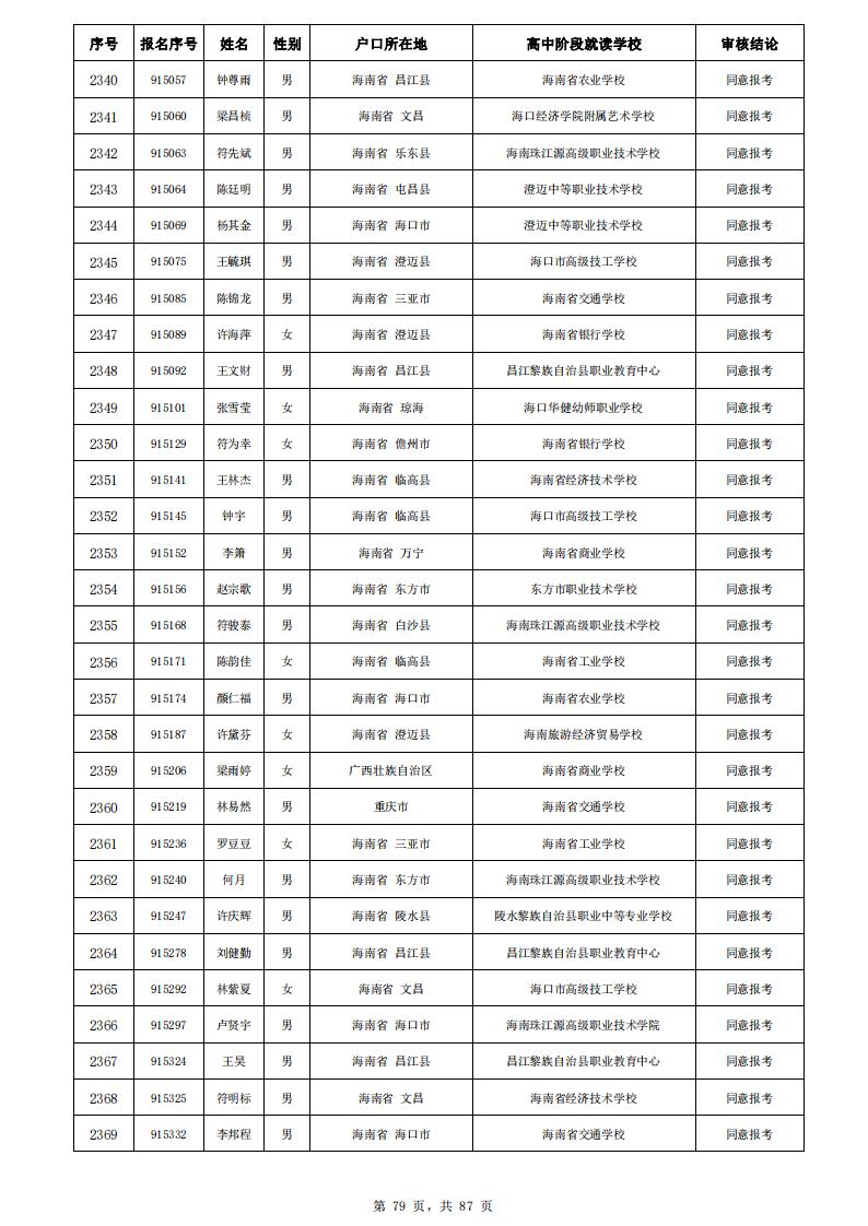 海南职业技术学院2024年海南省高职分类招生考试报名资格审查汇总表