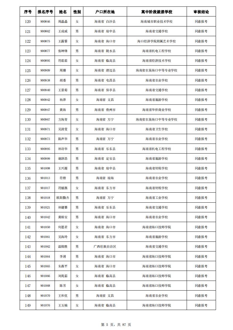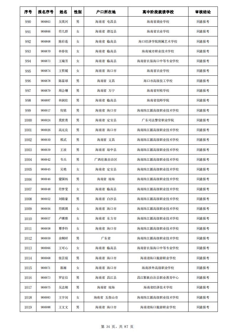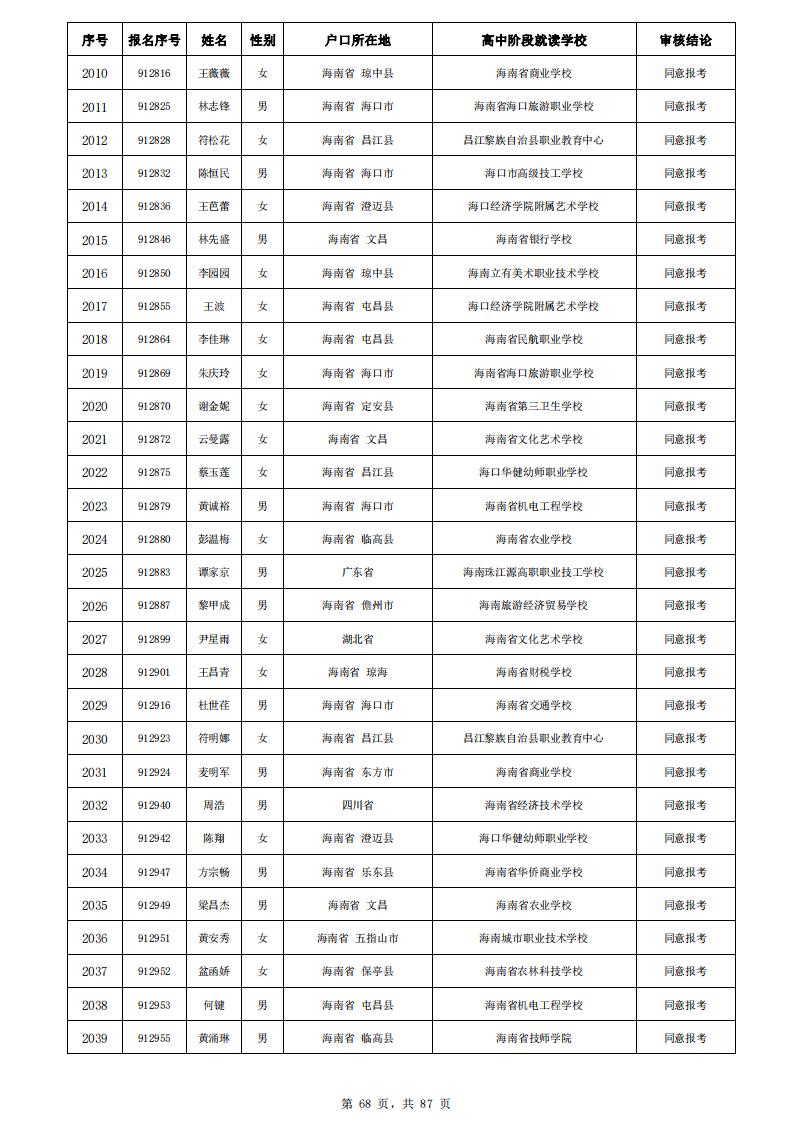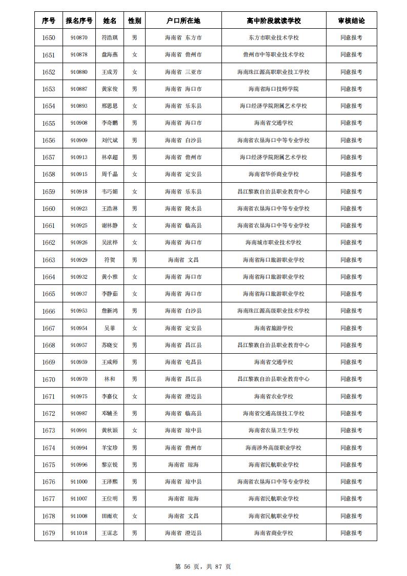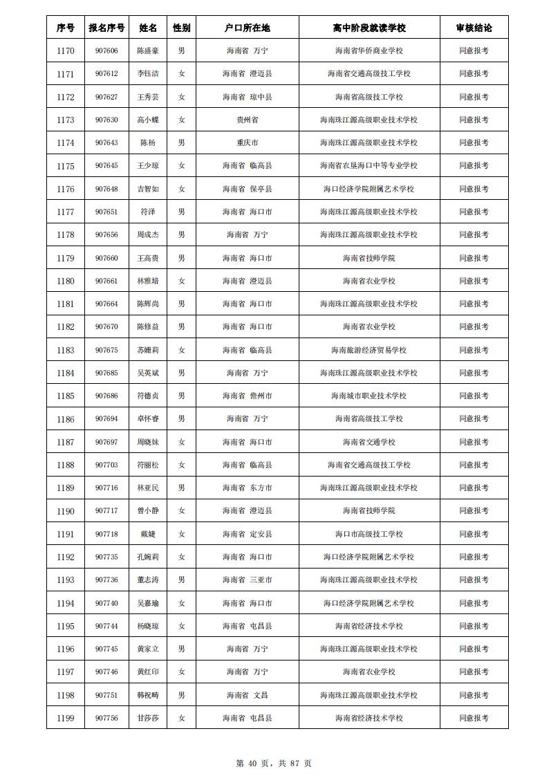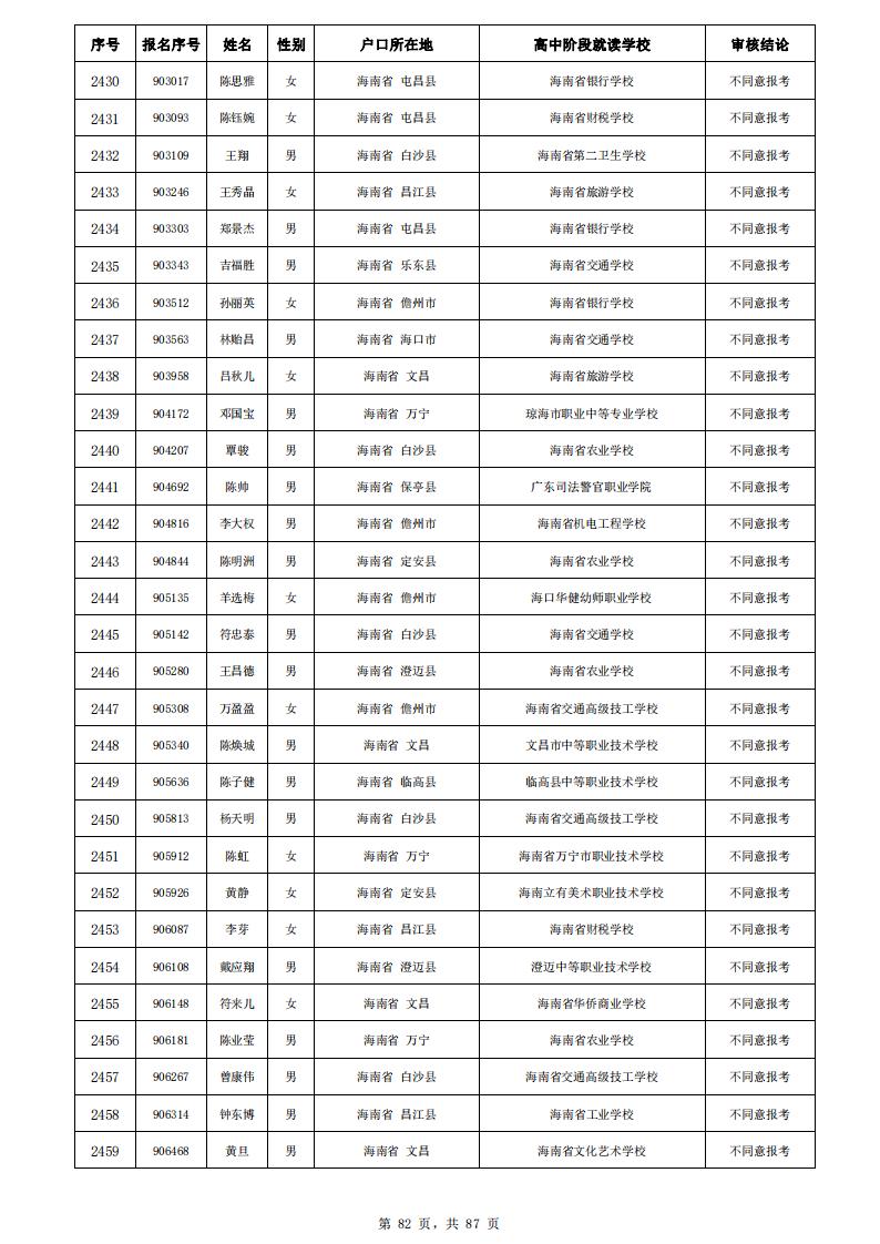 海南职业技术学院2024年海南省高职分类招生考试报名资格审查汇总表