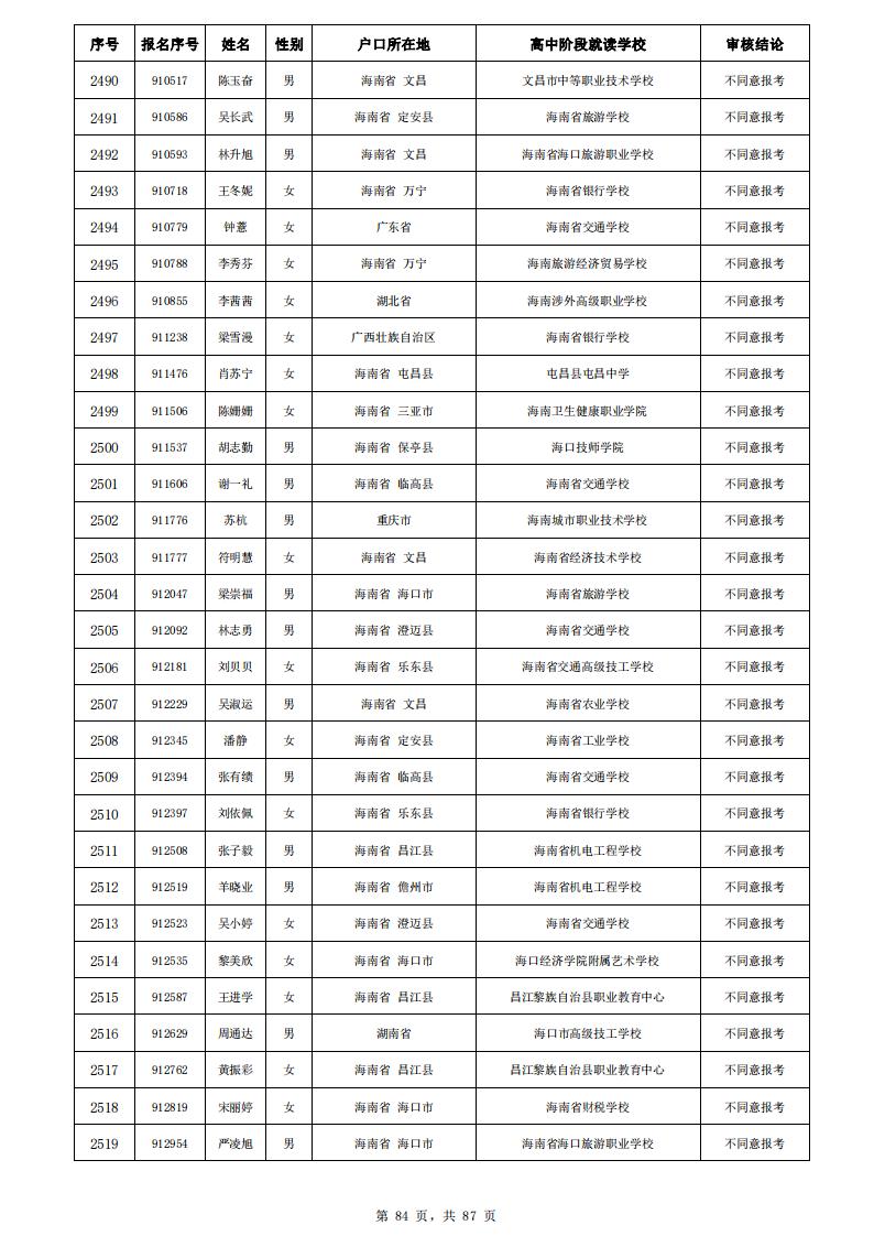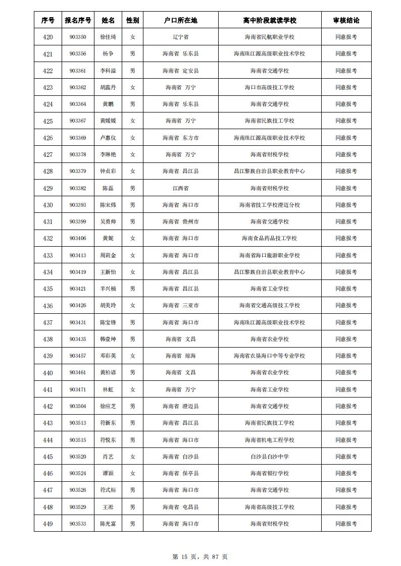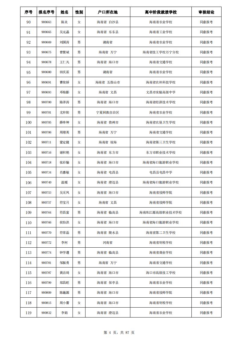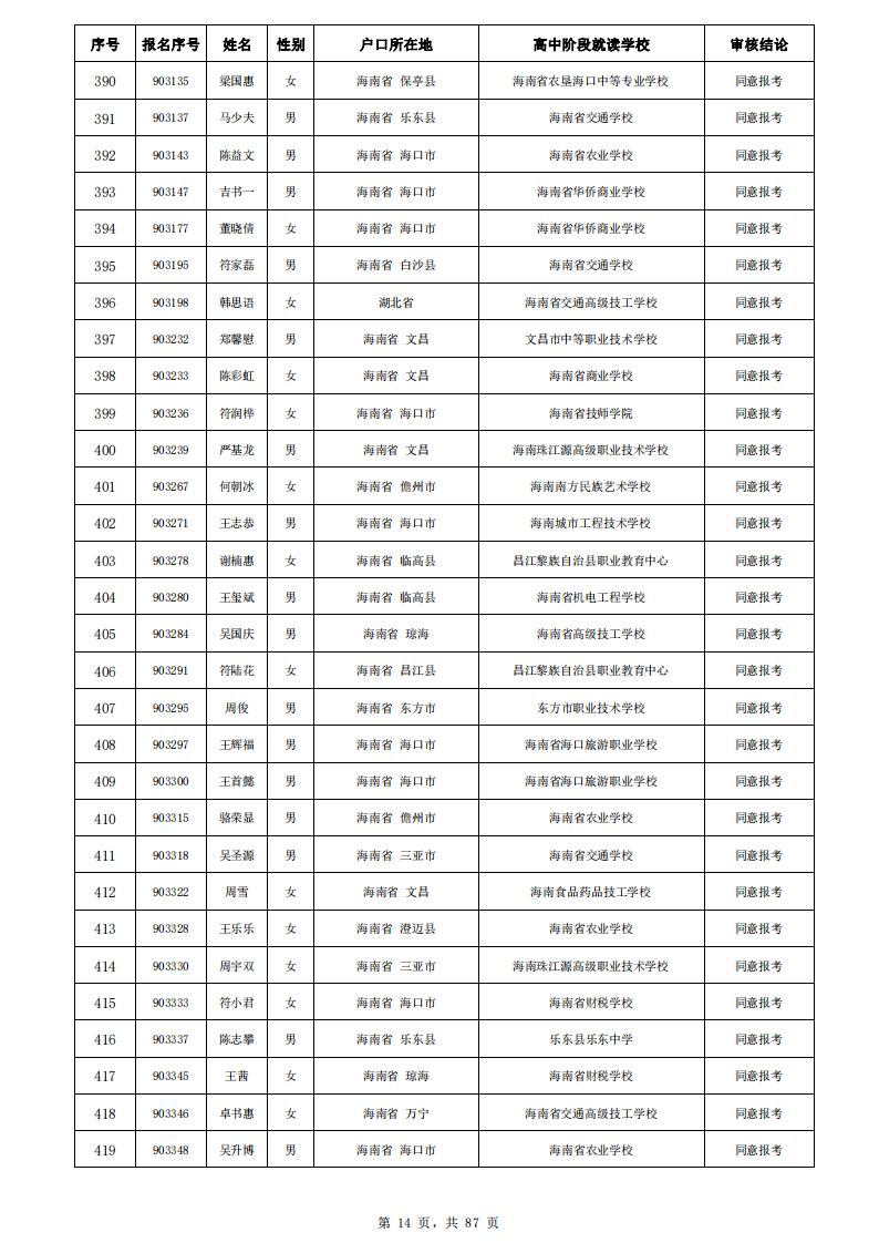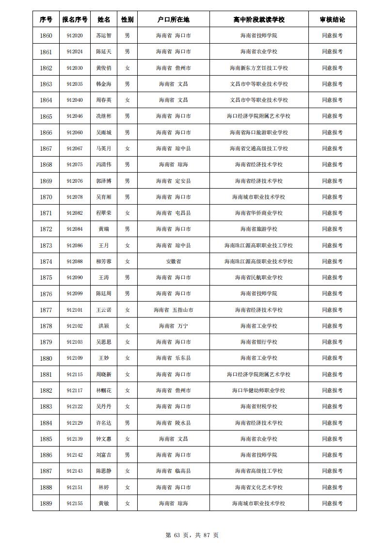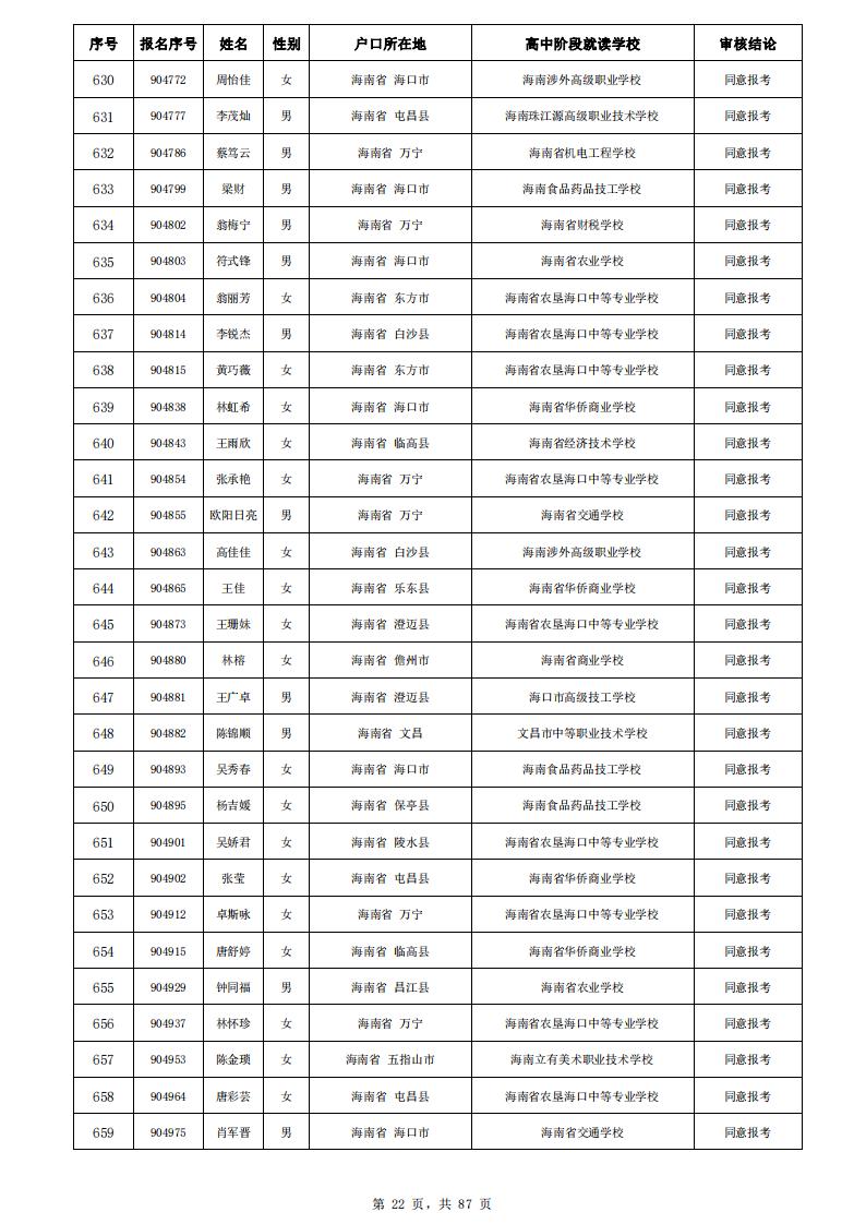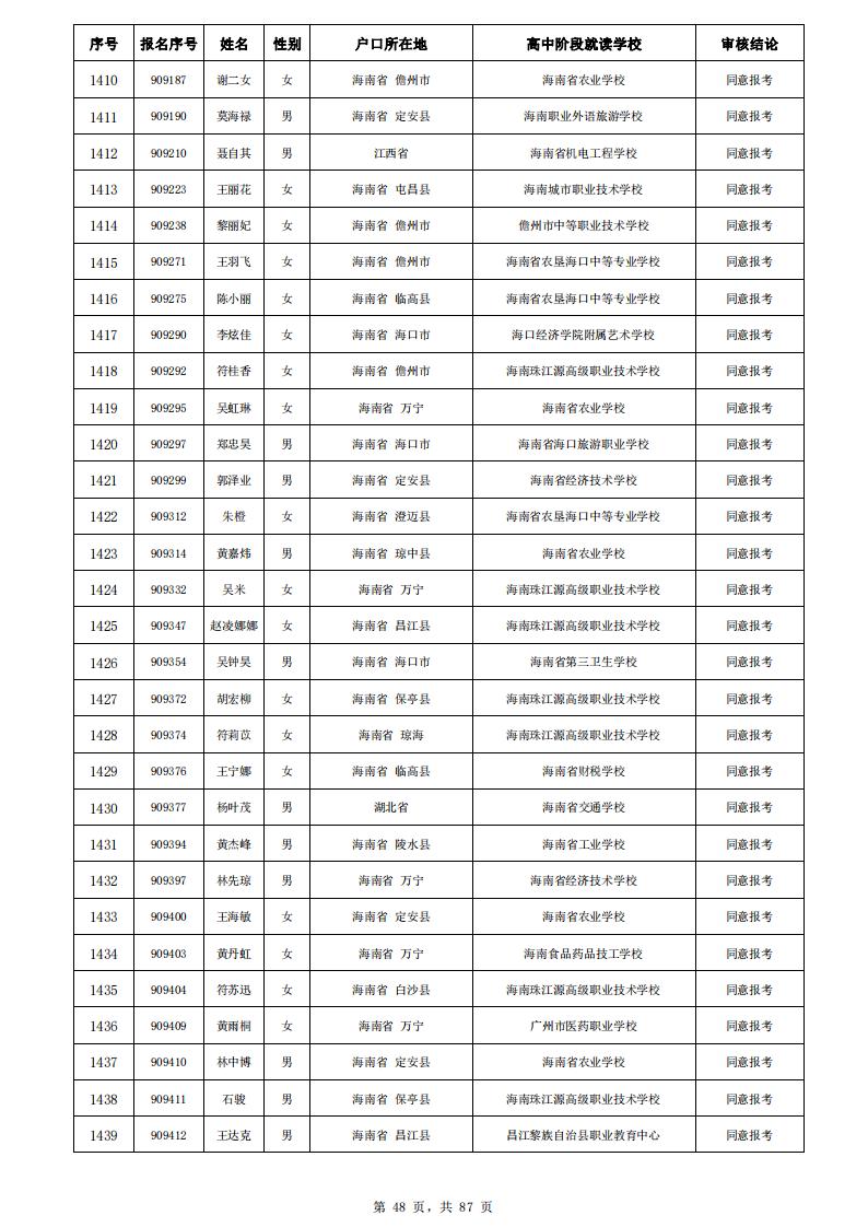 海南职业技术学院2024年海南省高职分类招生考试报名资格审查汇总表