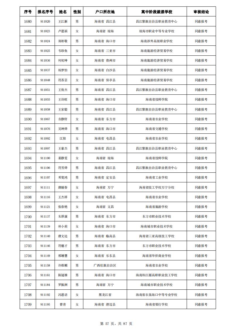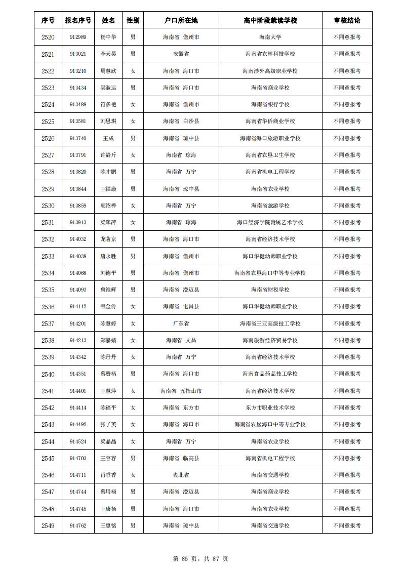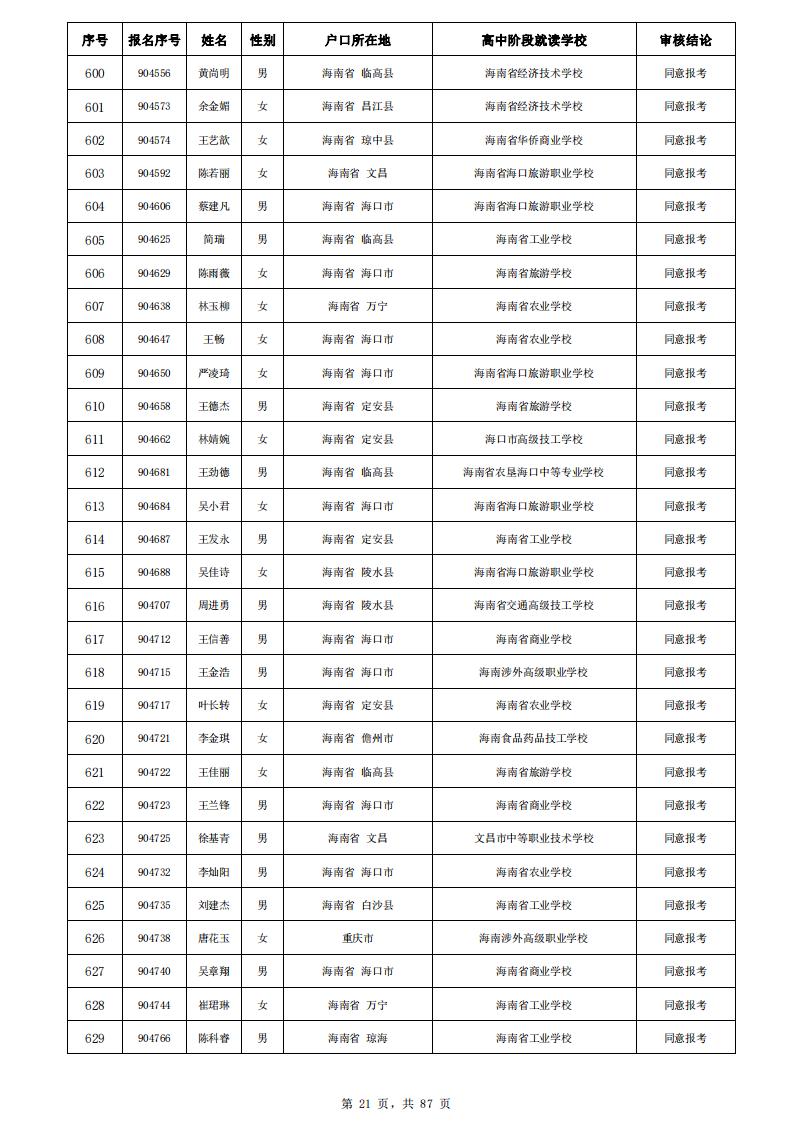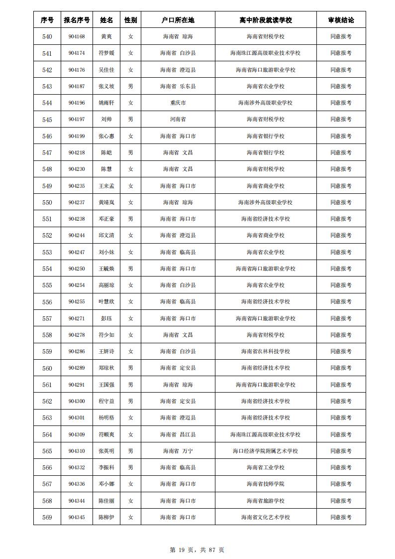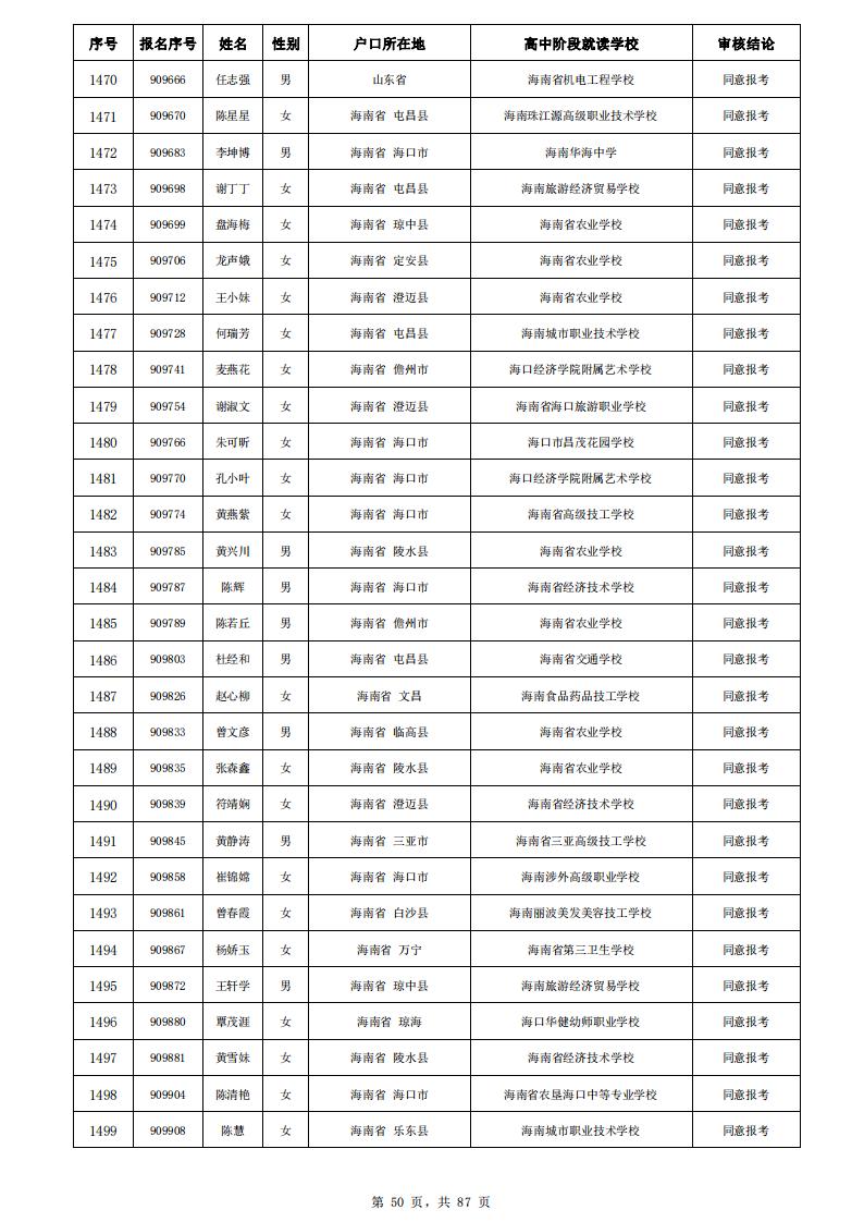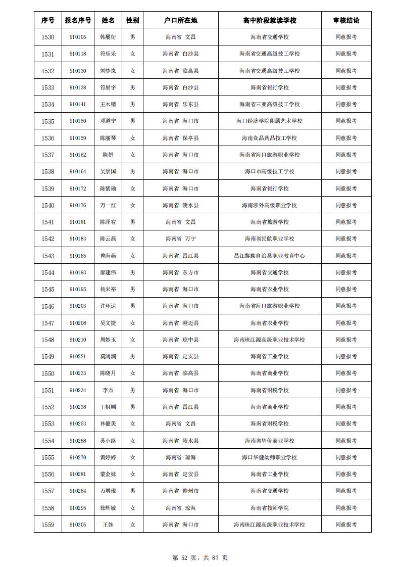 海南职业技术学院2024年海南省高职分类招生考试报名资格审查汇总表