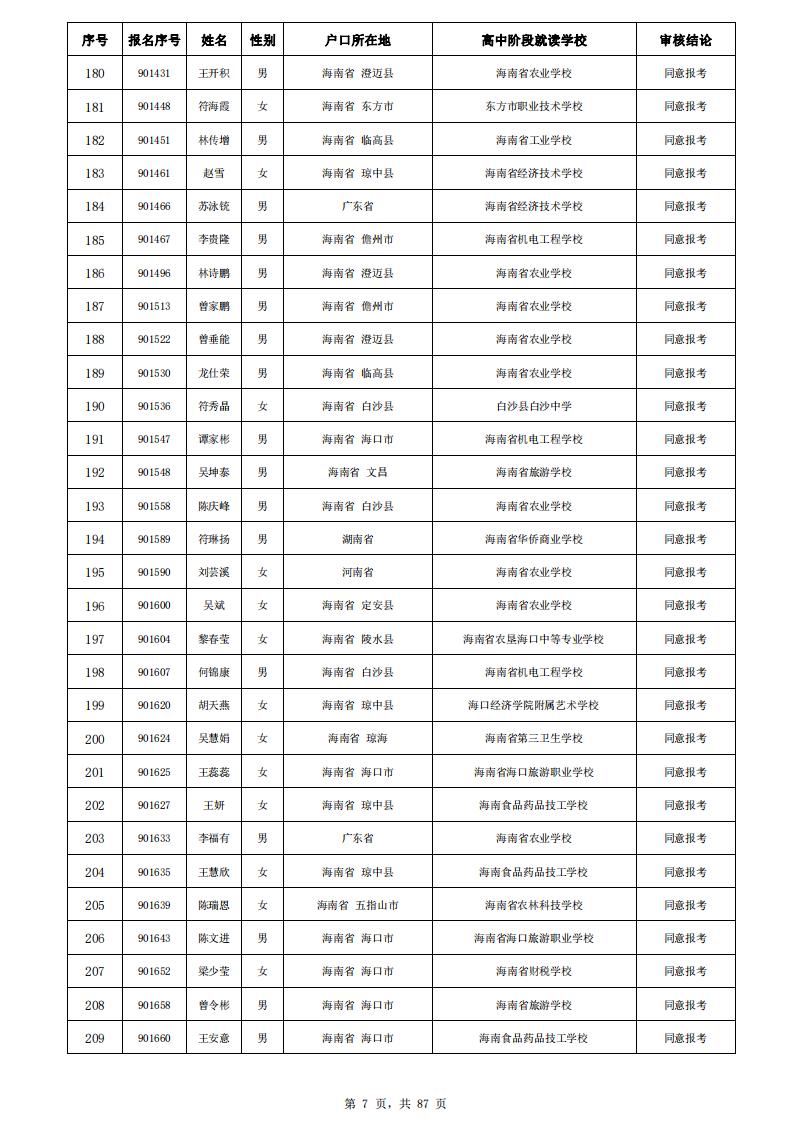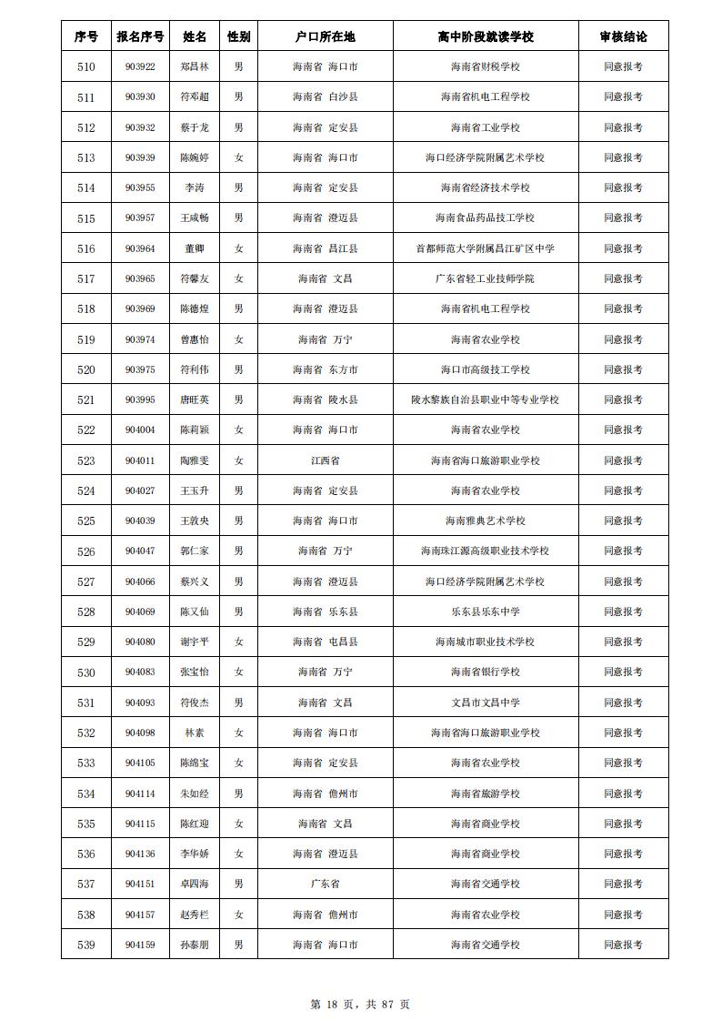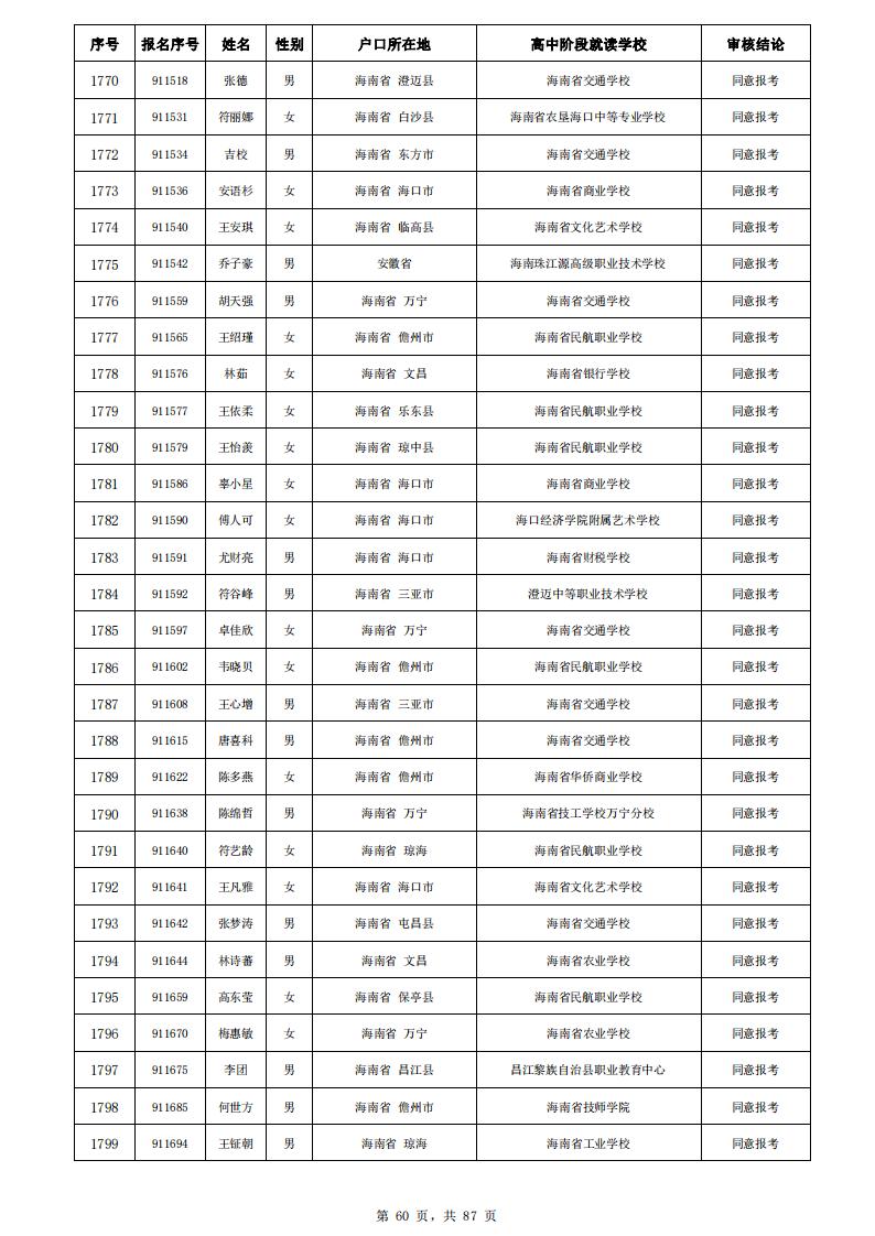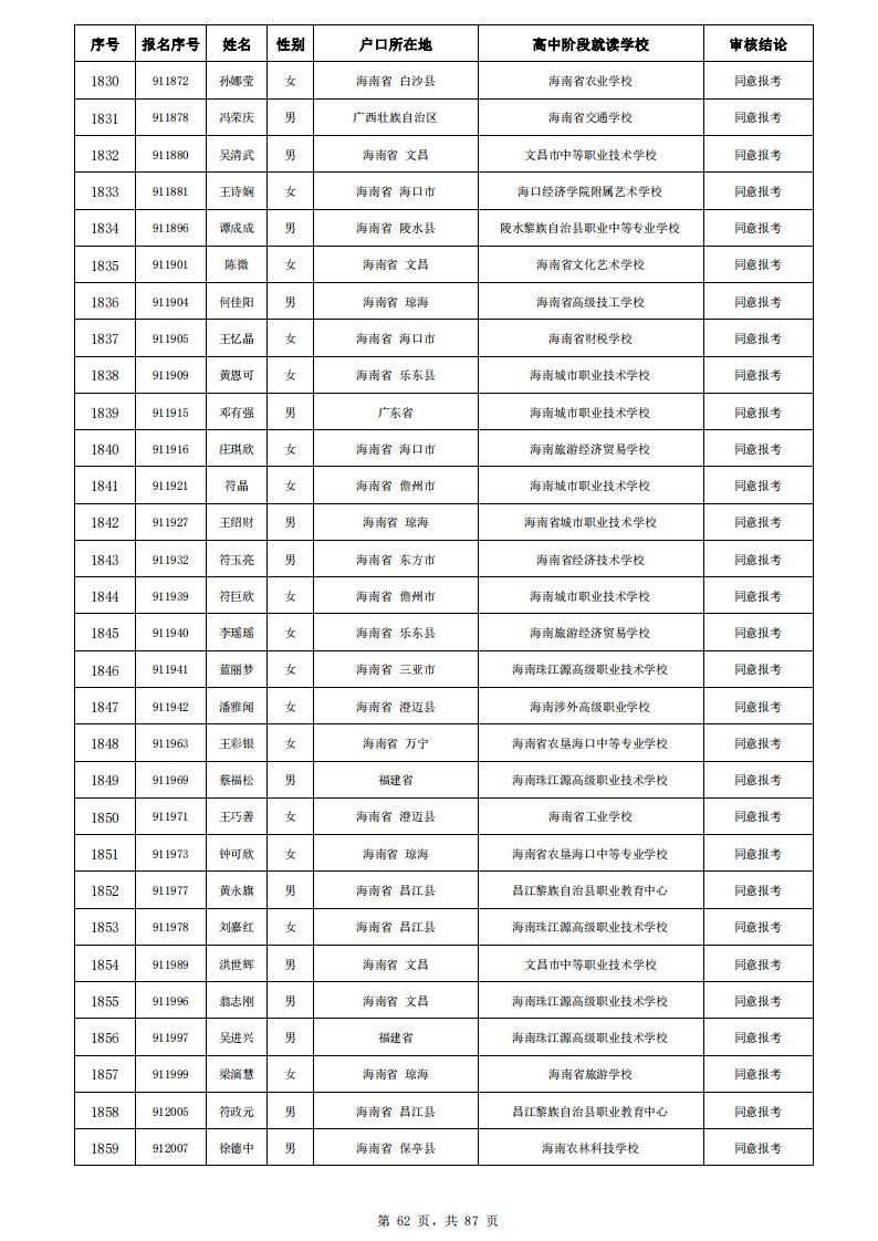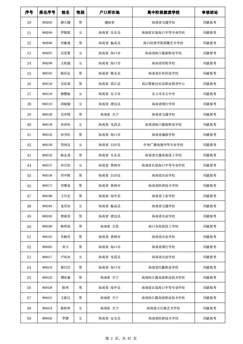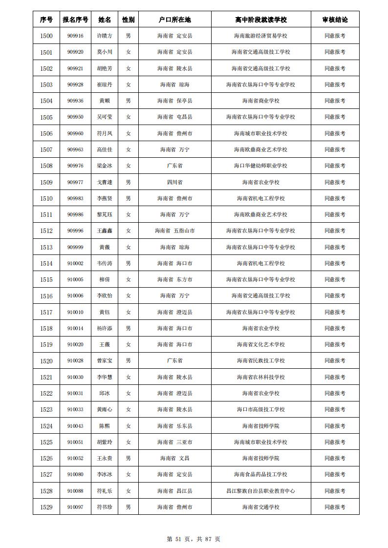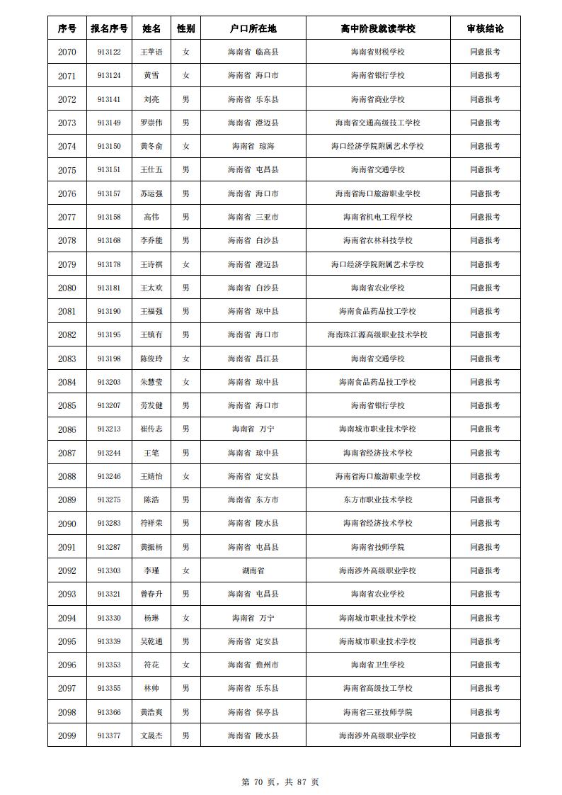 海南职业技术学院2024年海南省高职分类招生考试报名资格审查汇总表