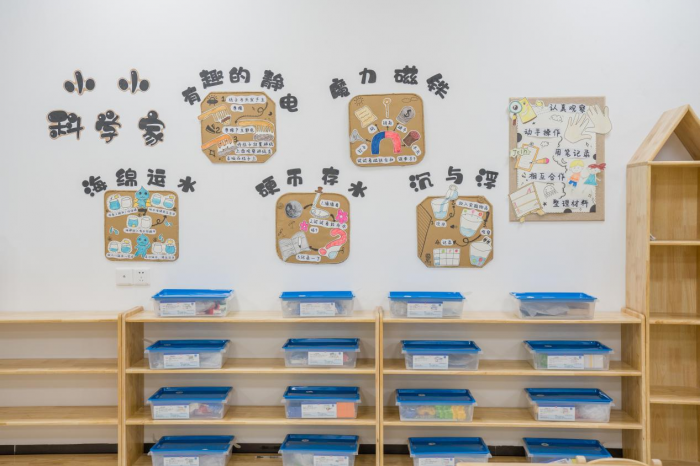 科学教育实训室:是以科技创造为主题,作为园所未来教室和整体环境创设的功能性补充,给孩子以可操作、趣味性强、发挥幼儿和教师创造力的互动空间。实训室教具设备涵盖四大科学领域。主要有生命科学、物质科学、地球空间科学和设计与技术四个领域的课程,其中生命科学包括植物、动物和人;物质科学包括声音、光影、电、磁、空气、力和运动;地球空间科学包括资源、太空;设计与技术包括工具、设计、机器人等。实训室总容量为50人,主要承接的课程为《幼儿园教育活动设计与指导》《学前儿童行为观察与评价》等。