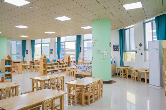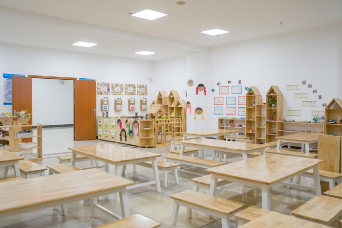 保育教育实训室:主要为学前教育专业学生提供幼儿园课程及课程相关的实习实训,实训室配有可触控教学一体机、幼儿实木课桌椅、五个区域活动教具,玩具柜等教学设施和实木儿童床等,容量为50人,主要承接的课程为《学前卫生学》《学前心理学》《幼儿文学》《幼儿园班级管理》等。