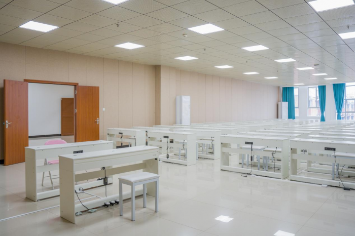 钢琴实训室:主要用于对学前教育专业学生进行钢琴专业技能集中教学和学生课外实训。配有52架电子钢琴、钢琴琴凳、希沃教学一体机等教学套件等设备,实训室总容量为50人,主要承接的课程为《乐理视唱练耳》《钢琴基础》《儿歌即兴伴奏》等。
