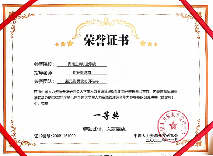 11月6日,第七届“踏瑞杯”全国大学生人力资源管理综合能力竞赛高职组全国总决赛落下帷幕,我校选手2020级和2021级人力资源管理专业学生赵元昊、吴俊龙、郑浩冉三名同学代表学校荣获高职组一等奖好成绩。