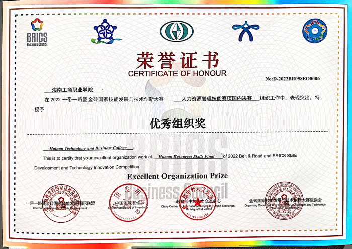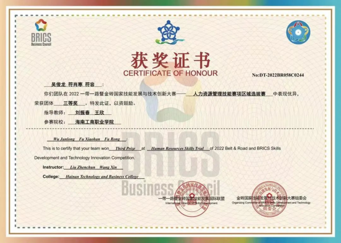 11月12日,2022 一带一路暨金砖国家技能发展与技术创新大赛之人力资源管理技能赛项全国总决赛落下帷幕,我校人力资源管理专业学生符肖寒、吴俊龙、符容组成的海南工商职业学院代表队荣获全国总决赛二等奖的好成绩。