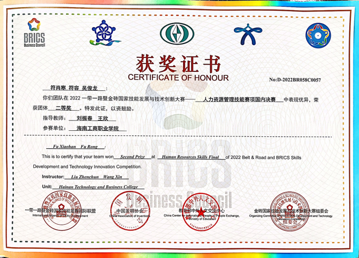 2022 一带一路暨金砖国家技能发展与技术创新大赛之人力资源管理技能赛项全国总决赛全国二等奖