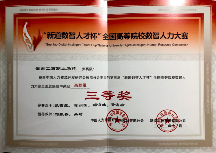 11月26日,2022 第三届新道数智人才杯全国高等院校数智人力大赛落下帷幕,海南工商职业学院代表队荣获三等奖的好成绩。
