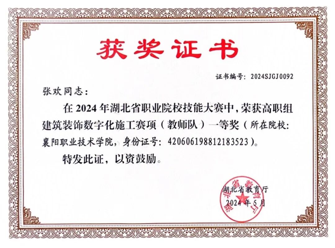 张欢 | 2023年 | 湖北省职业院校技能大赛“建筑装饰数字化施工”赛项(教师组) | 一等奖 | |